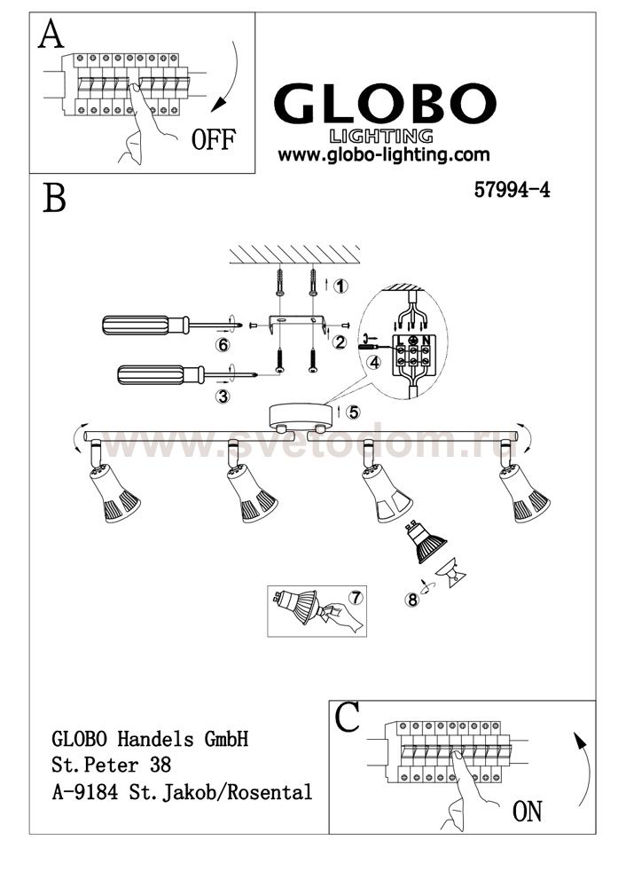 Светильники-споты – это оригинальные изделия с современным дизайном. Они позволяют не ограничивать свою фантазию при выборе освещения для интерьера. Такие модели обеспечивают достаточно качественный свет. Благодаря компактным размерам Вы можете использовать несколько спотов для одного помещения. Интернет-магазин «Светодом» предлагает необычный светильник-спот Globo 57994-4 по привлекательной цене. Эта модель станет отличным дополнением к люстре, выполненной в том же стиле. Перед оформлением заказа изучите характеристики изделия. Купить светильник-спот Globo 57994-4 в нашем онлайн-магазине Вы можете либо с помощью формы на сайте, либо по указанным выше телефонам. Обратите внимание, что у нас склады не только в Москве и Екатеринбурге, но и других городах России.