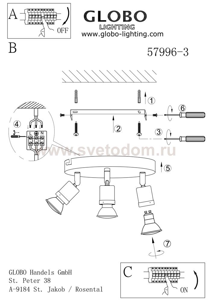 Светильники-споты – это оригинальные изделия с современным дизайном. Они позволяют не ограничивать свою фантазию при выборе освещения для интерьера. Такие модели обеспечивают достаточно качественный свет. Благодаря компактным размерам Вы можете использовать несколько спотов для одного помещения. Интернет-магазин «Светодом» предлагает необычный светильник-спот Globo 57996-3 по привлекательной цене. Эта модель станет отличным дополнением к люстре, выполненной в том же стиле. Перед оформлением заказа изучите характеристики изделия. Купить светильник-спот Globo 57996-3 в нашем онлайн-магазине Вы можете либо с помощью формы на сайте, либо по указанным выше телефонам. Обратите внимание, что у нас склады не только в Москве и Екатеринбурге, но и других городах России.