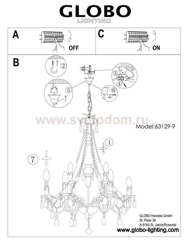 Компания «Светодом» предлагает широкий ассортимент люстр от известных производителей. Представленные в нашем каталоге товары выполнены из современных материалов и обладают отличным качеством. Благодаря широкому ассортименту Вы сможете найти у нас люстру под любой интерьер. Мы предлагаем как классические варианты, так и современные модели, отличающиеся лаконичностью и простотой форм. Стильная люстра Globo 63129-9 станет украшением любого дома. Эта модель от известного производителя не оставит равнодушным ценителей красивых и оригинальных предметов интерьера. Люстра Globo 63129-9 обеспечит равномерное распределение света по всей комнате. При выборе обратите внимание на характеристики, позволяющие приобрести наиболее подходящую модель. Купить понравившуюся люстру по доступной цене Вы можете в интернет-магазине «Светодом».