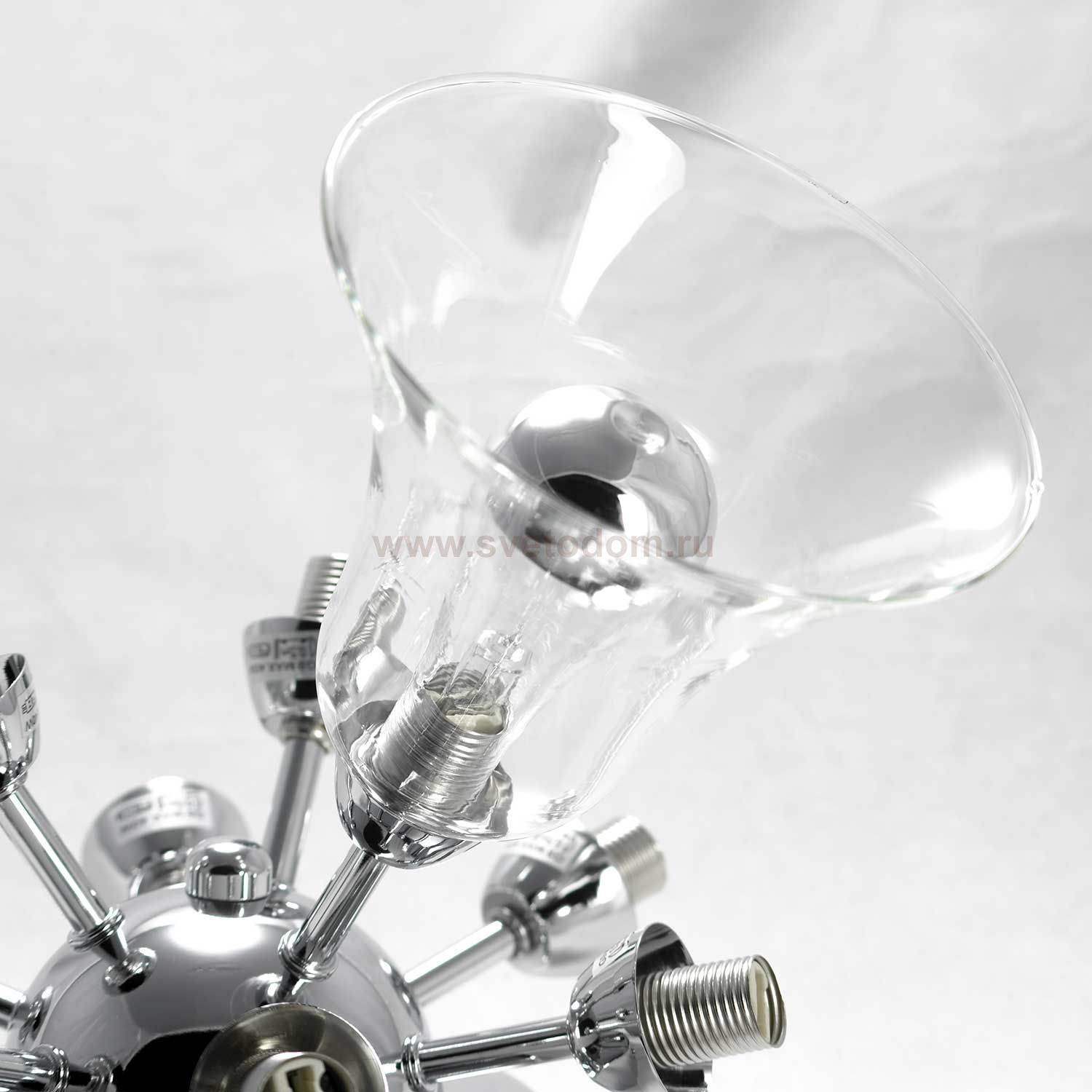 потолочный светильник с девятью стеклянными прозрачными плафонами из тонкого стекла напоминающими раструб духового инструмента. Много раструбная компоновка в светильнике призвана распределять свет в направлении самого раструба, а прозрачные плафоны перепускать излишки света в смежном направлении.