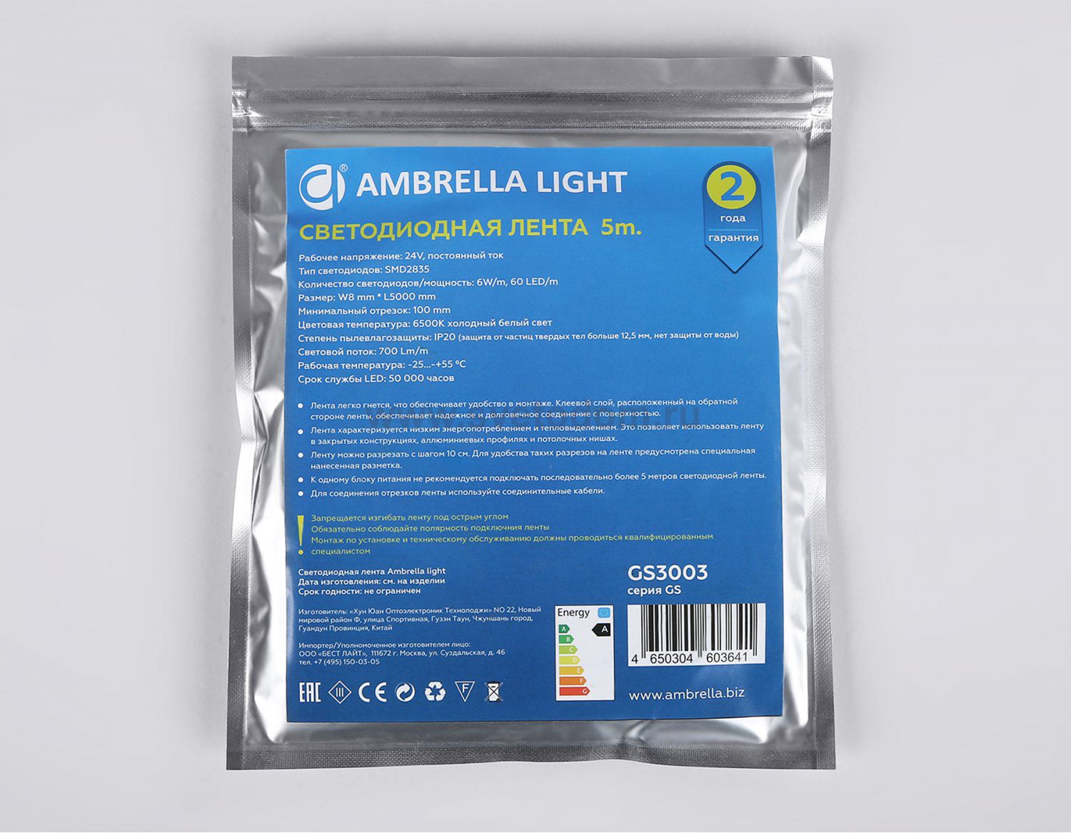 Светодиодная лента Ambrella Light GS3003 2835 60Led /6W m/ 24V IP20 6500K 5m Артикул производителя