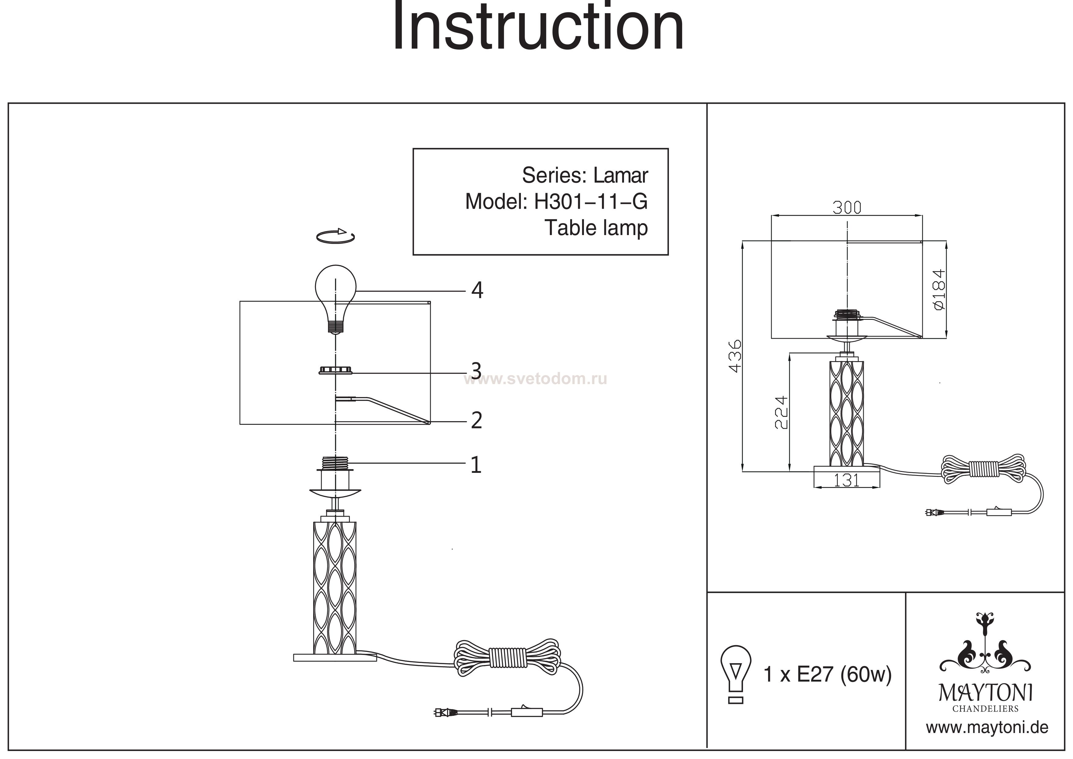 Арматура из металла. Абажур из ПВХ покрыт хлопковой тканью. Рекомендуем использовать компактные люминесцентные лампы (КЛЛ) или LED лампы. Дополнительно
