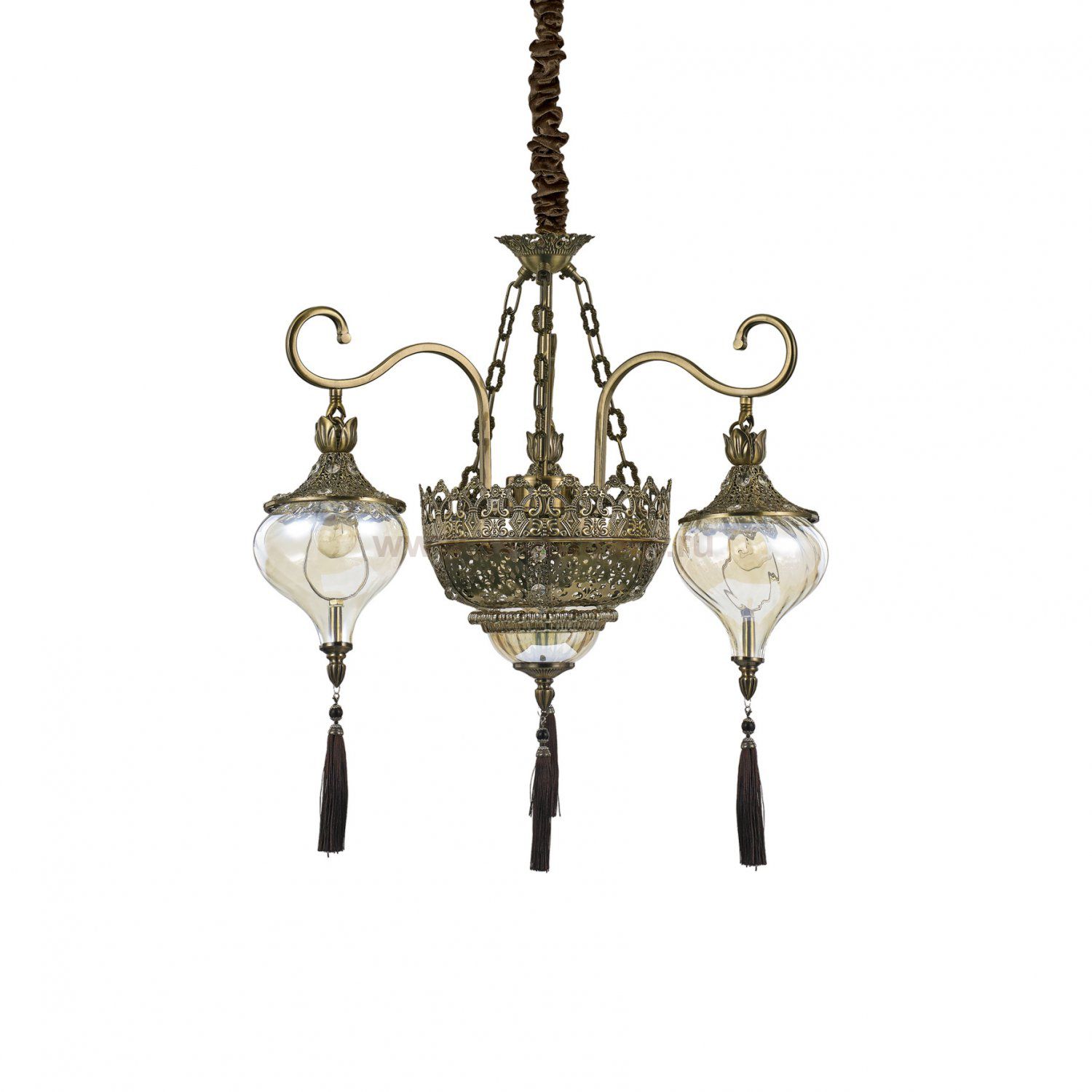 Арматура с рельефными декорациями из металла в коричневом цвете и встроенными востмиугольными хрусталиками с фацетом. Рассеиватель из дутого прозрачного стекла слегка янтарного цвета с висящими кисточками. Цепь скрыта бархатной тканью.