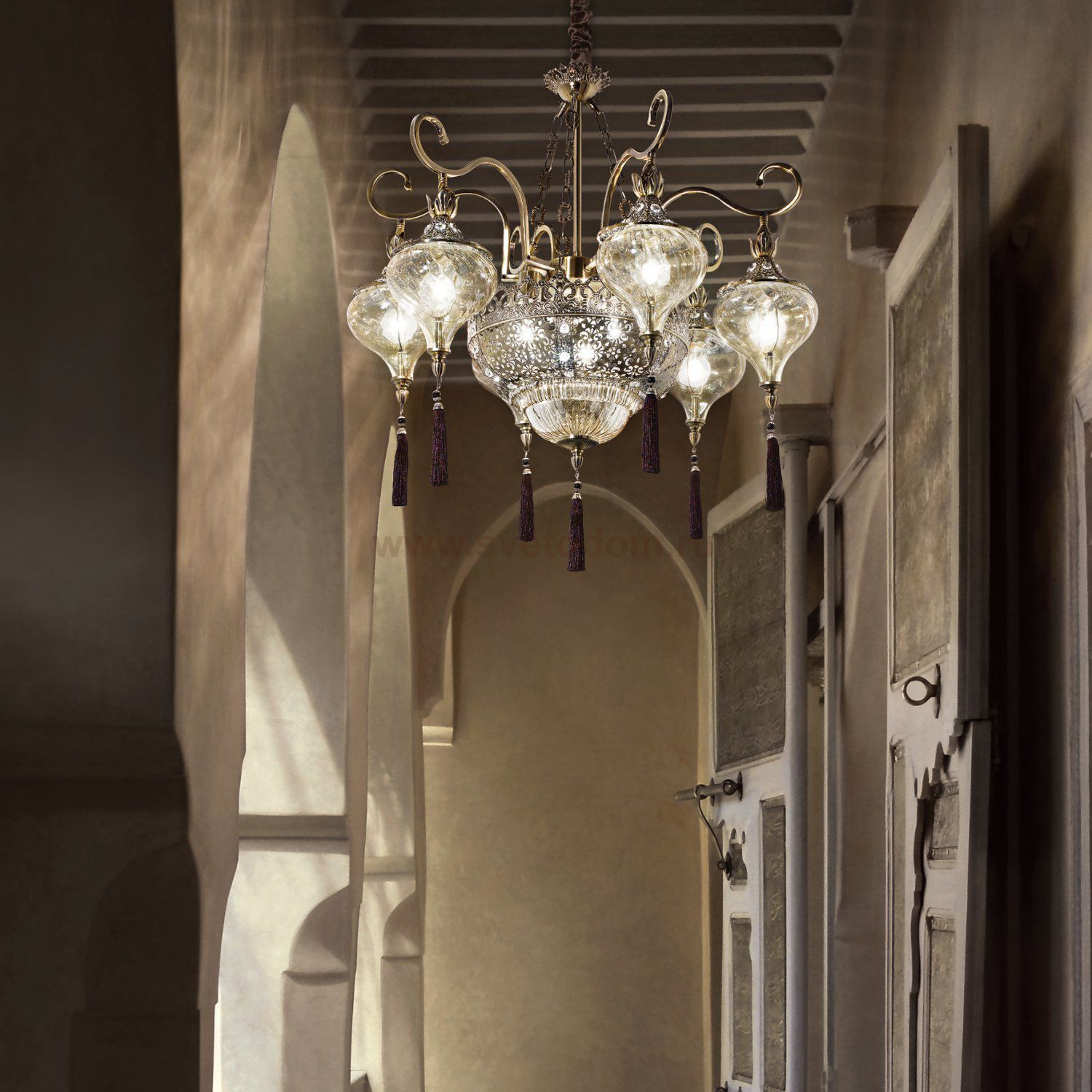 Арматура с рельефными декорациями из металла в коричневом цвете и встроенными востмиугольными хрусталиками с фацетом. Рассеиватель из дутого прозрачного стекла слегка янтарного цвета с висящими кисточками. Цепь скрыта бархатной тканью.