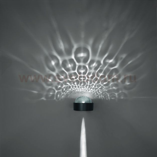 Необычный настенный светильник со встроенными светодиодными источниками. Верхний и нижний свет. На верхний световой излучатель прикреплен плафон, который отбрасывает на стену красивые тени, нижний дает тонкую струю света.Зашита от влаги IP 20.