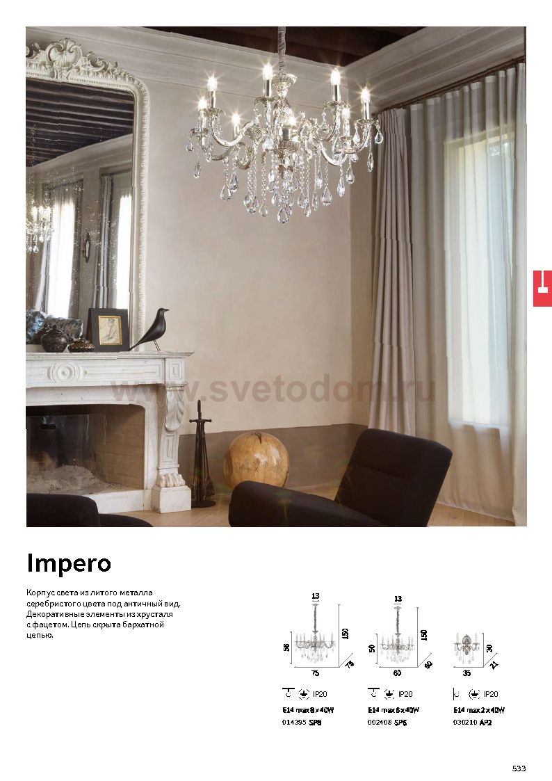 Компания «Светодом» предлагает широкий ассортимент люстр от известных производителей. Представленные в нашем каталоге товары выполнены из современных материалов и обладают отличным качеством. Благодаря широкому ассортименту Вы сможете найти у нас люстру под любой интерьер. Мы предлагаем как классические варианты, так и современные модели, отличающиеся лаконичностью и простотой форм. Стильная люстра Ideal lux IMPERO SP8 станет украшением любого дома. Эта модель от известного производителя не оставит равнодушным ценителей красивых и оригинальных предметов интерьера. Люстра Ideal lux IMPERO SP8 обеспечит равномерное распределение света по всей комнате. При выборе обратите внимание на характеристики, позволяющие приобрести наиболее подходящую модель. Купить понравившуюся люстру по доступной цене Вы можете в интернет-магазине «Светодом».