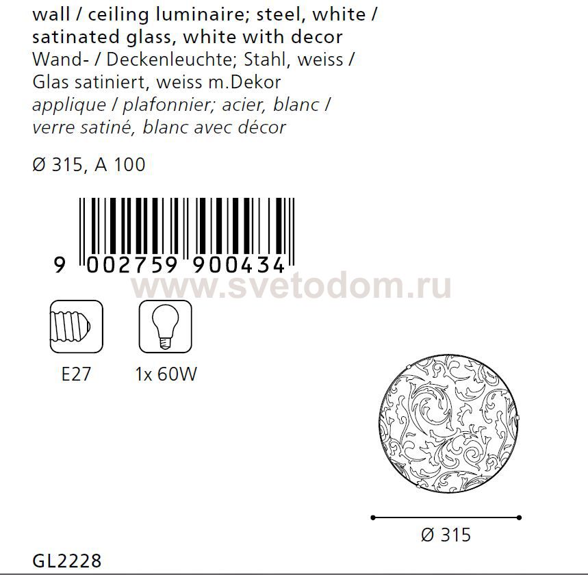 Австрийское качество модели светильника Eglo 90043 не оставит равнодушным каждого купившего! Матовое закаленное стекло(пр-во Чехия) вытравленный рисунок , основание сталь с защитным покрытием. Класс изоляции 2 (двойная изоляция), IP 20, освещенность 806 lm ,D=315,1X60W,E27.
