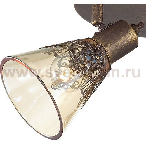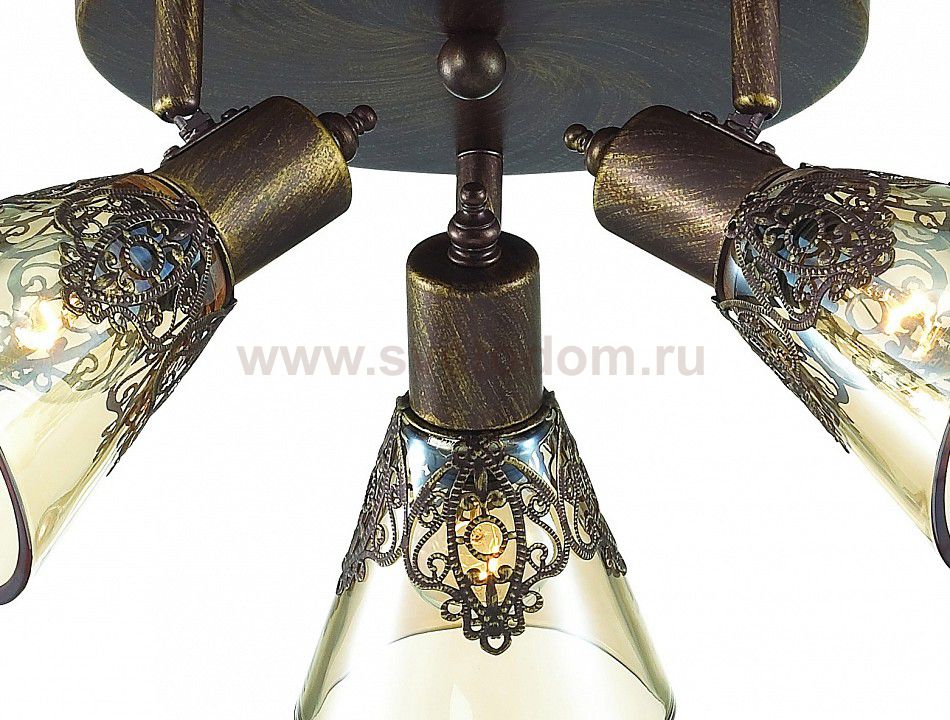 каркас коричневого цвета с золотой патиной, декоративный узор из металла на плафоне, плафон из прозрачного стекла коньячного оттенка Штрих-код