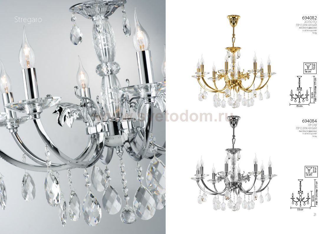 Аскетичная подвесная люстра Stregaro выполнена в виде жирандоли - фигурного подсвечника для нескольких свечей. Ее фигурные лампочки стилизованы под восковые свечи, освещающие своим ровным пламенем огромные средневековые залы. Свет, проходя сквозь хрустальные чаши, проникает в крупные подвески, преломляется в их гранях и брызгами разлетается вокруг! Это блистающее великолепие смягчают плавные линии рожков и их матовый цвет латуни, делая композицию люстры уравновешенной. Стильная люстра Lightstar 694084 станет украшением любого дома. Эта модель от известного производителя не оставит равнодушным ценителей красивых и оригинальных предметов интерьера. Люстра Lightstar 694084 обеспечит равномерное распределение света по всей комнате. При выборе обратите внимание на характеристики, позволяющие приобрести наиболее подходящую модель. Купить понравившуюся люстру по доступной цене Вы можете в интернет-магазине «Светодом».