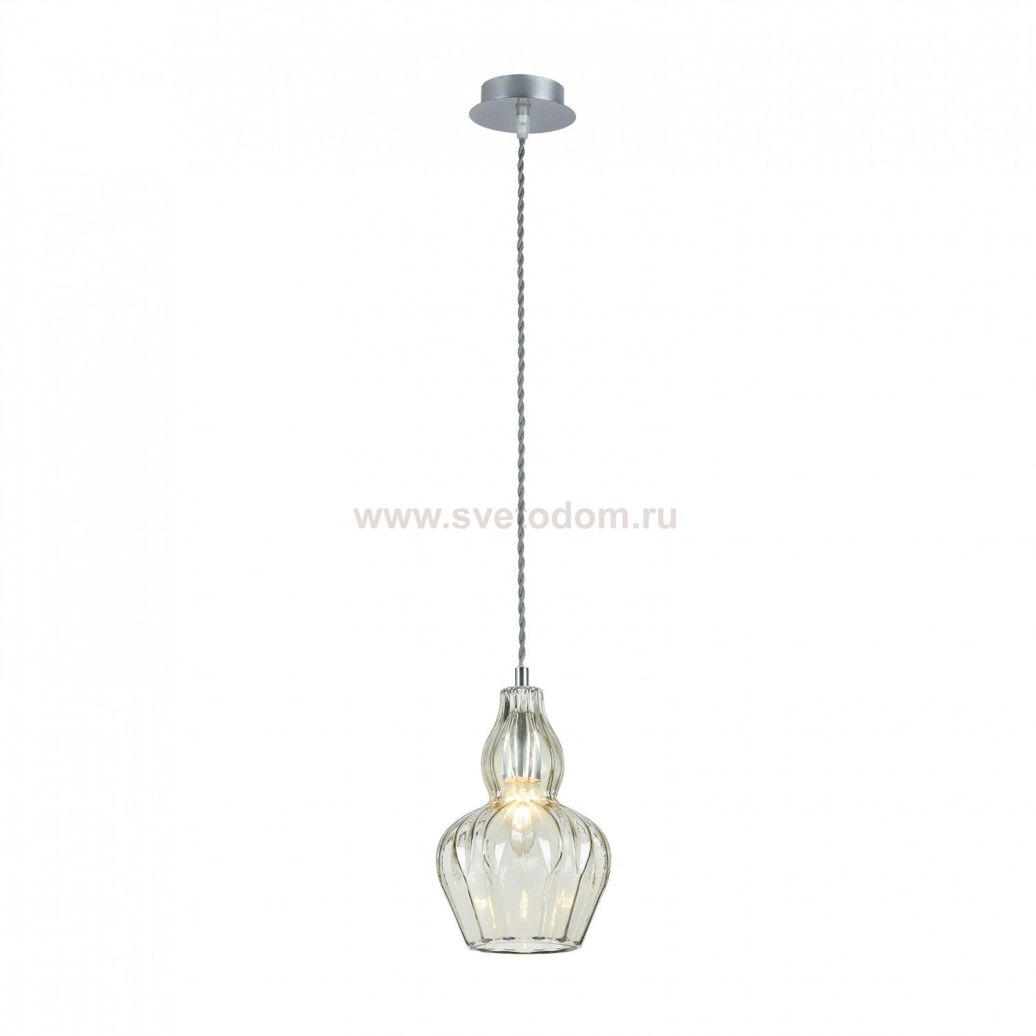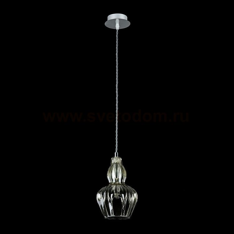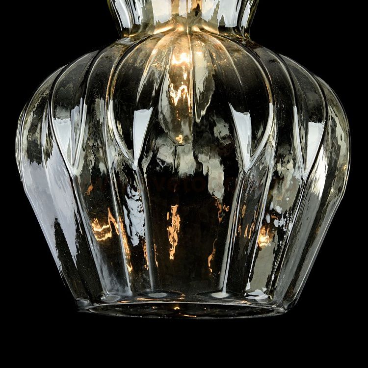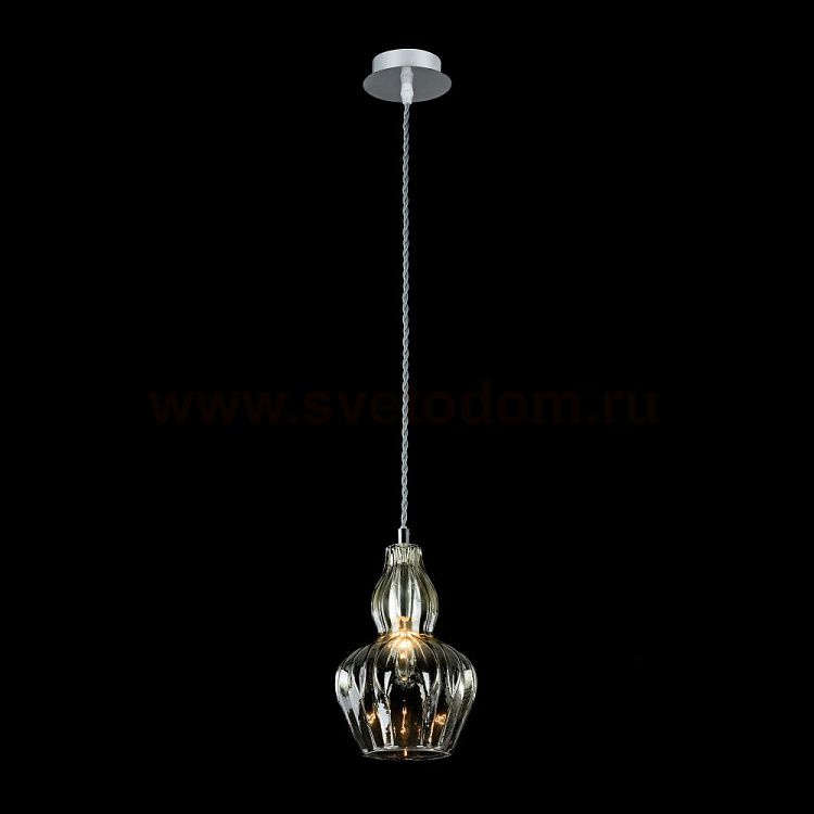 Арматура — металл, оттенок — никель. Рельефный плафон выполнен из стекла. Оттенки плафона — прозрачный и голубой. Витой провод. Регулируемая высота.