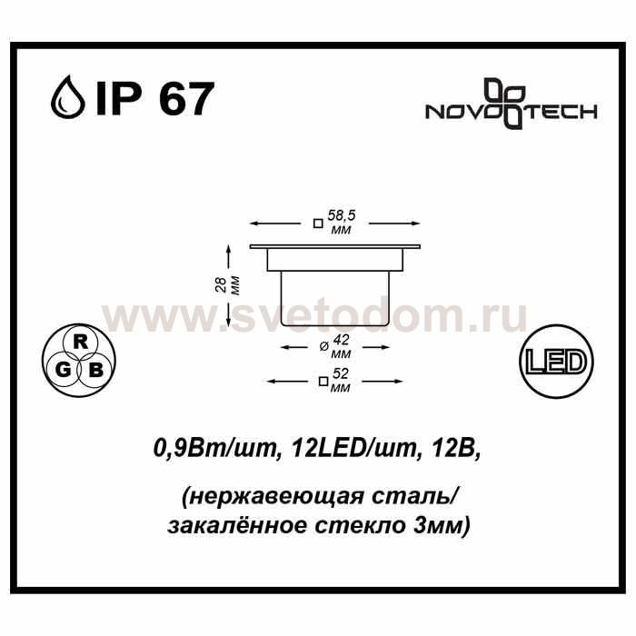 Ландшафтный встраиваемый светодиодный светильник модели Novotech 357141 из серии LED GROUND отличается следующим качеством: Корпус светильника сделано из нержавеющей стали. Её главным преимуществом является большой период эксплуатации. Сталь по праву можно считать "вечным" материалом. Так же преимуществами являются устойчивость к химическим, атмосферным и механическим воздействиям и эстетичный внешний вид. Благодаря зеркальной полировке, обеспечивается высокая стойкость металла к коррозии. Рассеиватель сделан из закаленного стекла. Оно выдерживает температуру от -70 до 250С., а так же в 5-6 раз прочнее обычного. Высокие эксплуатационные характеристики, в частности, высокая механическая прочность. Идеально подходит для декоративной подсветки лестничных пролётов, террас, подпорных стенок. Различные варианты цвета освещения позволяют создавать незабываемые по красоте интерьеры и внешние открытые территории. Срок службы светодиодов до 40000 - 50000 часов.
