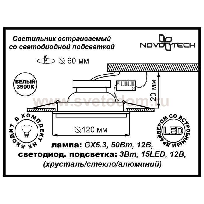Встраиваемый светильник со светодиодной подсветкой и встроенным драйвером модели Novotech 357307 из серии RIVA отличается следующим качеством: Декоративное украшение произведено из хрусталя. Хрусталь обладает высоким показателем плотности, прозрачности и блеска. Благодаря содержанию свинца (не менее 30%). Хрусталь обладает высоким показателем плотности, прозрачности и блеска. Благодаря содержанию свинца (не менее 30%) и определённому подбору углов, образуемых гранями, изделия из хрусталя отличаются необыкновенно яркой, многоцветной игрой света, чарующей магией красоты, совершенства и роскоши. Имееется возможность раздельного включения LED и лампы, при использовании двухклавишного выключателя света.
