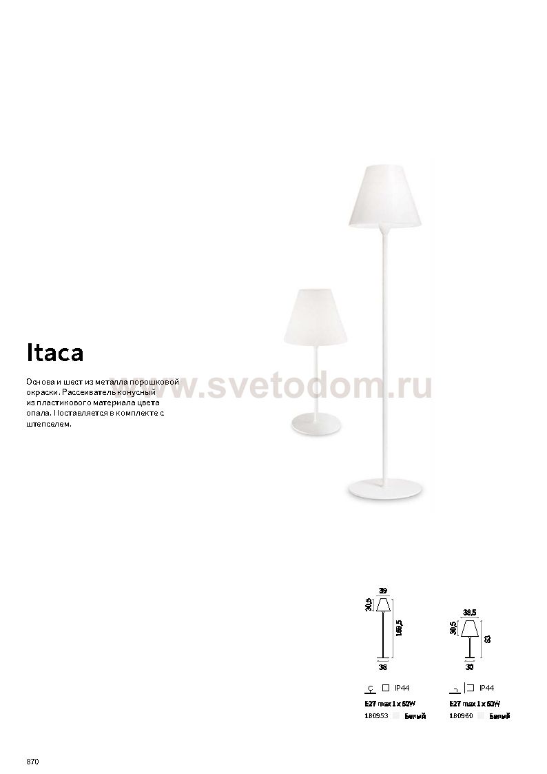 Настольная лампа от известной итальянской фабрики Ideal lux из каталога Esterno в современном стиле под артикулом ITACA TL1 (180960) серии ITACA имеет ряд отличительных характеристик: Основа и шест из металла порошковой окраски. Рассеиватель конусный из пластикового материала цвета опала. Поставляется в комплекте с штепселем.