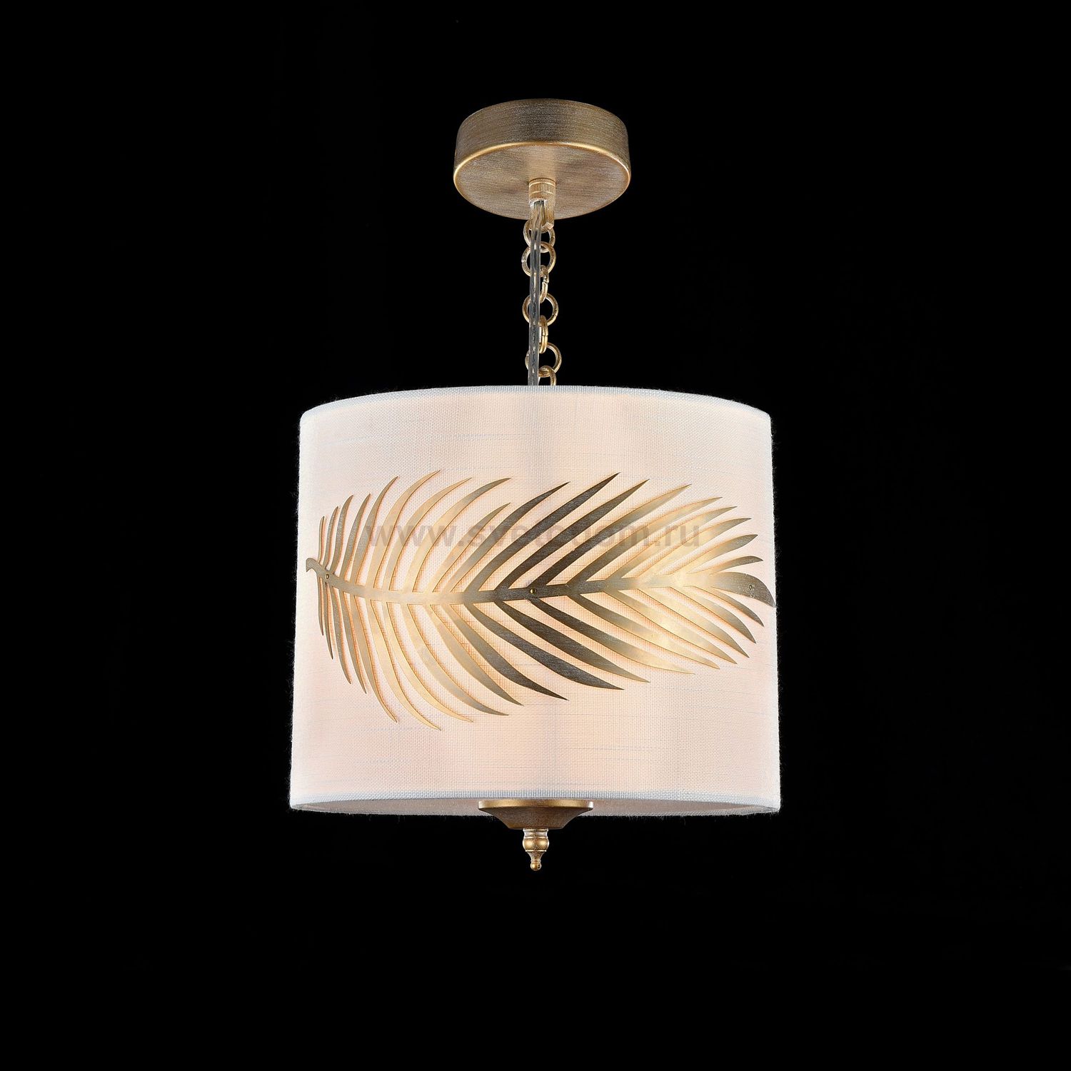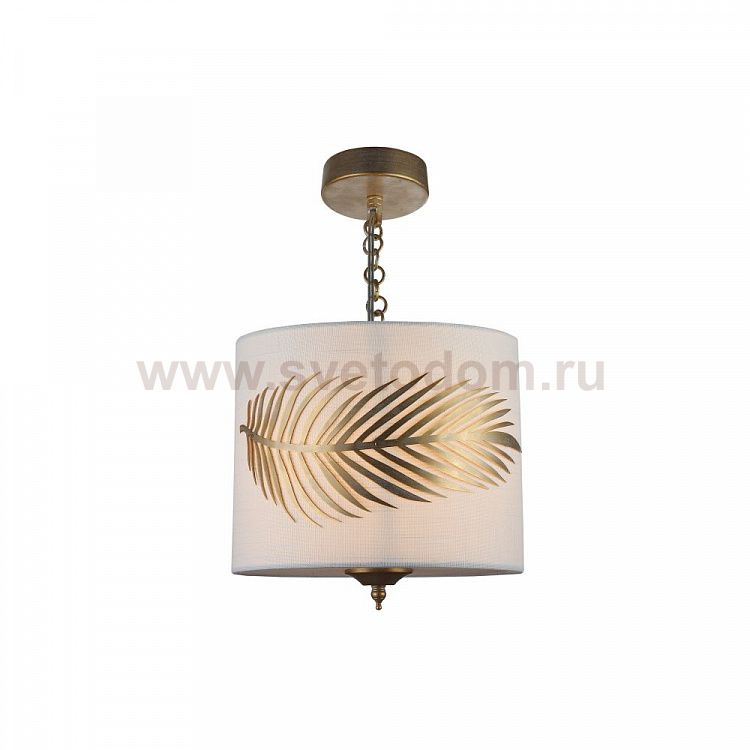 Абажур из ПВХ покрыт тканью, украшен декоративным металлическим элементом в виде листа папоротника. Цвет плафона / абажура