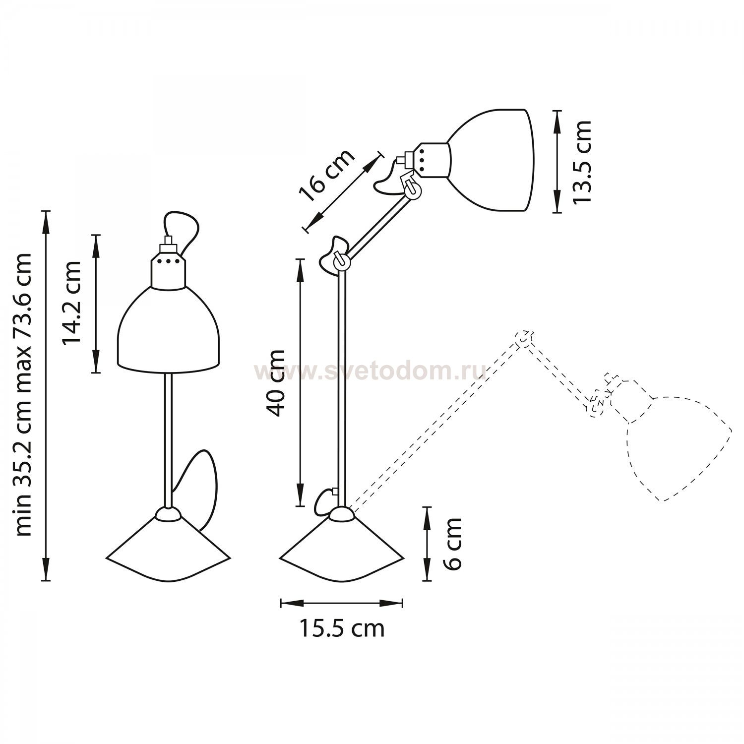 Высота min-max (см): 35,2-73,6; Ширина (см): 13,5; Вес (кг): 2,9; Кол-во ламп: 1; Мощность max (W): 40; Цвет основания/цвет стекла или абажура: White/Glass shade;
