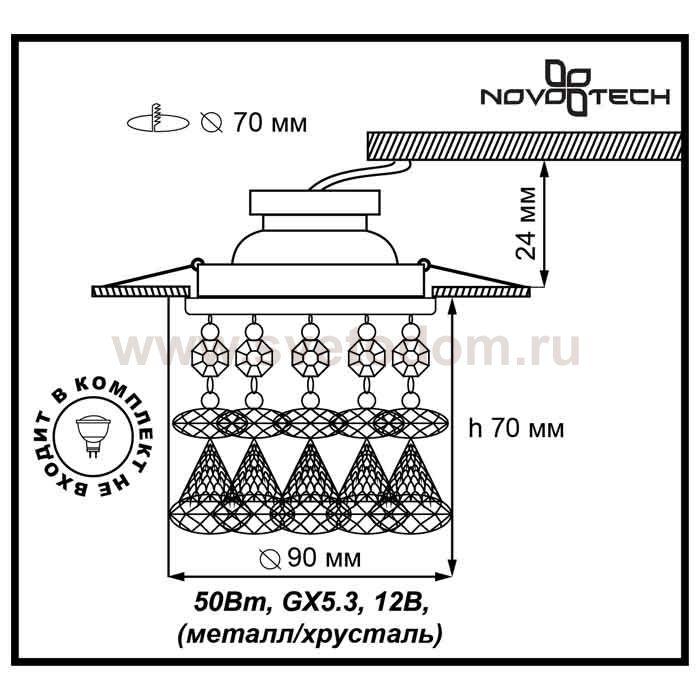 Декоративный встраиваемый светильник модели Novotech 369792 из серии RITZ отличается следующим качеством: Основание светильника сделано из металла. Это популярный и востребованный материал благодаря ряду качеств. К ним относится: повышенная прочность, износостойкость и долговечность. Подвески изготовлены из хрусталя. Он обладает высоким показателем плотности, прозрачности и блеска. Благодаря содержанию свинца (не менее 30%) и определённому подбору углов, образуемых гранями, изделия из хрусталя отличаются необыкновенно яркой, многоцветной игрой света, чарующей магией красоты, совершенства и роскоши. А так же, он обладают красивым звоном.