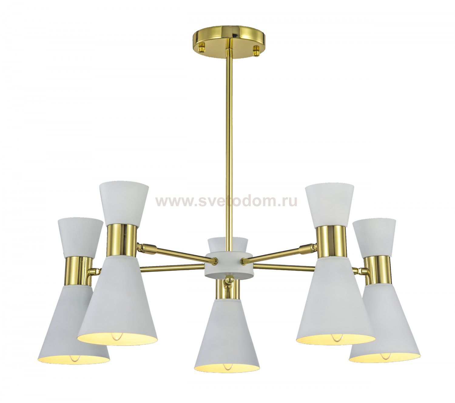 Люстра Elisium выполнена в светлом дизайне, на основе золотистого металлического каркаса и стеклянных элементов из матового стекла. Пять держателей с лампами расходятся лучами из одного центра в форме белого круга, закрепленного на кронштейне. Плафоны состоят их двух усеченных конусов, соединенных между собой золотым кольцом, нижний конус заключает в себе лампочку, а верхний служит эффектным элементом декора.