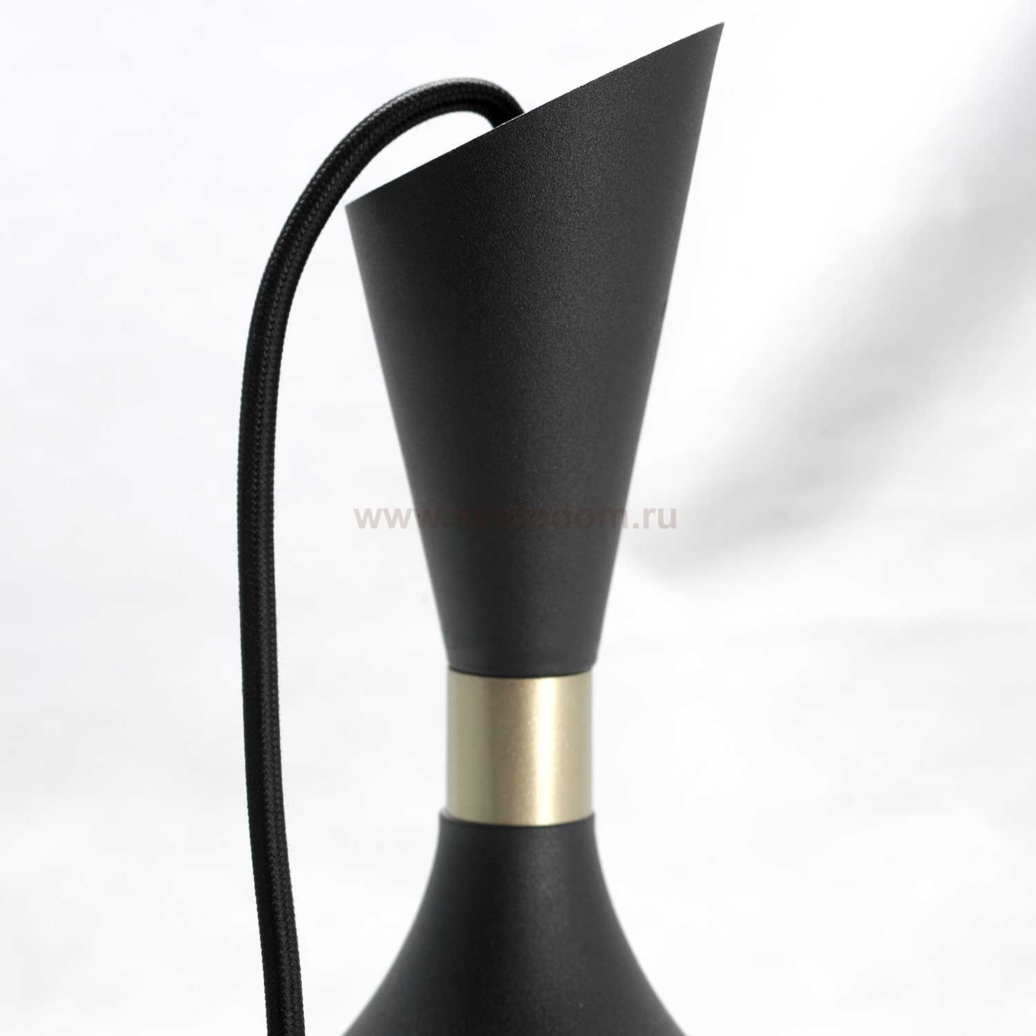 Черный небольшой подвес выполнен из металла, с возможностью изменения высоты подвеса, оснащен цоколем Е27 для применения ламп с высокой светоотдачей. Приталенная форма подвеса не имеет вертикальной симметрии, вверх от талии меньше, а вниз больше, также на так называемой талии разместился и так называемый пояс бронзового цвета.