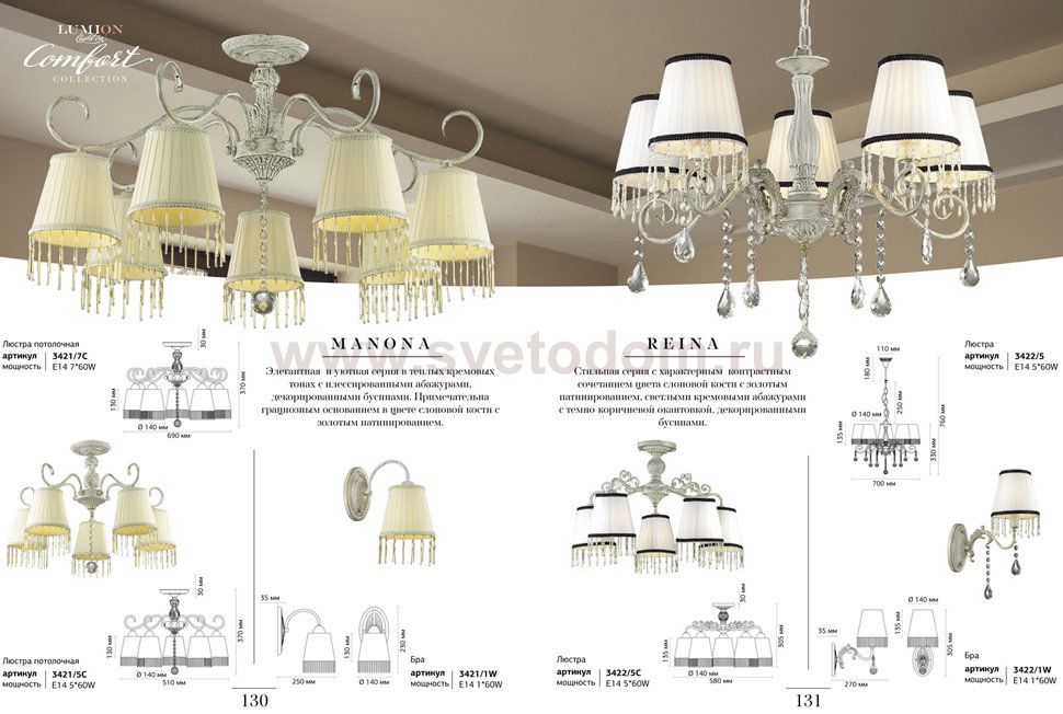 Стильная серия с характерным контрастным сочетанием цвета слоновой кости с золотым патинированием, светлыми кремовыми абажурами с темно-коричневой окантовкой, декорированными бусинами.