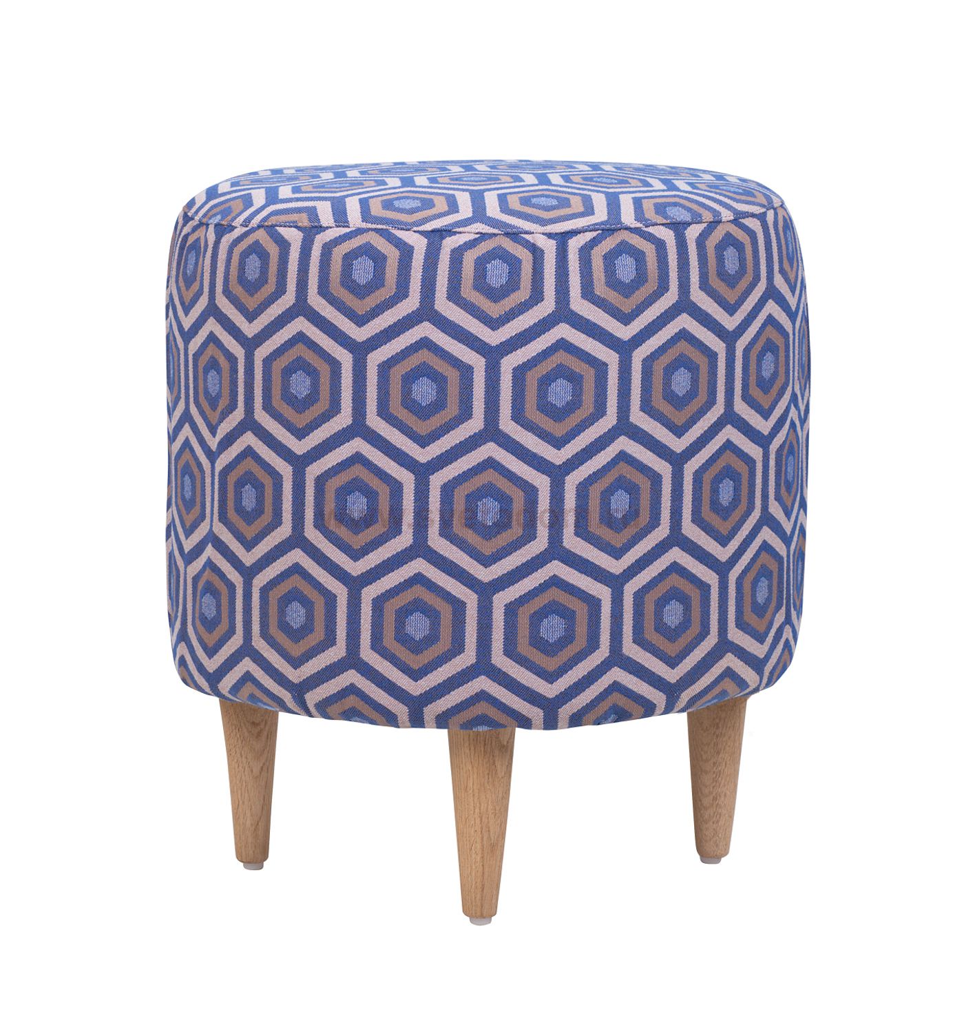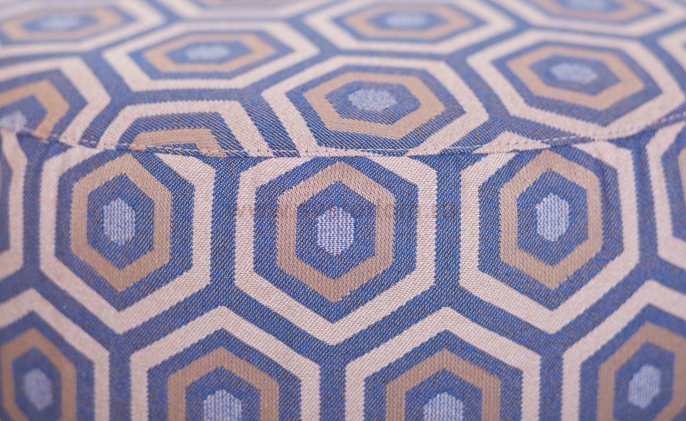 Пуфик «East» blue круглой формы, на конусовидных ножках из массива бука. Верх выполнен из мягкой ткани с геометрическим рисунком, в виде вписанных друг в друга разноцветных шестиугольников. Модель способна стать эффектным украшением интерьера, подходит для жилых комнат, оформленных в современном стиле.