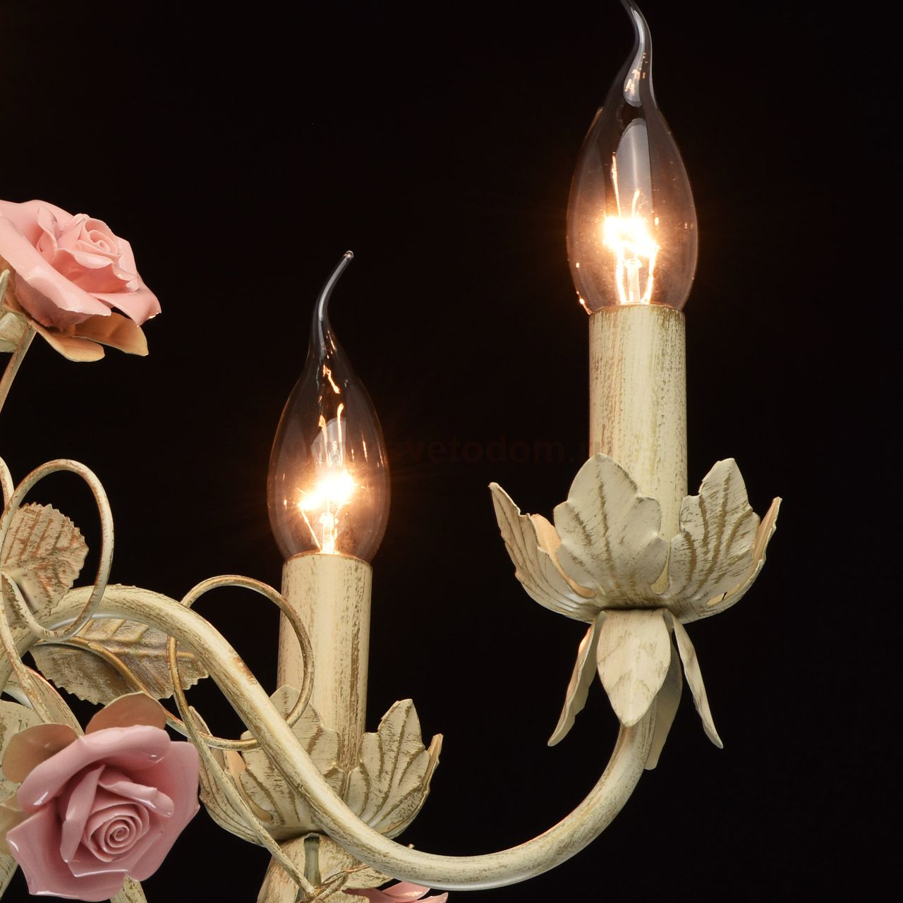 Изящная люстра выполнена в нежном флористическом стилеПриятный бежевый цвет с эффектом золотого патинирования позволяет люстре встроиться в большинство интерьеровТрадиционная форма свечи создает высокие параметры освещенияНежно розовые керамические розы делают люстру необыкновенно изящной и романтичнойИдеальное решение для спальни или гостиной выполненных в стиле Прованс.Широкая семья дает возможность осветить смежные помещения в одном стиле Технология производства