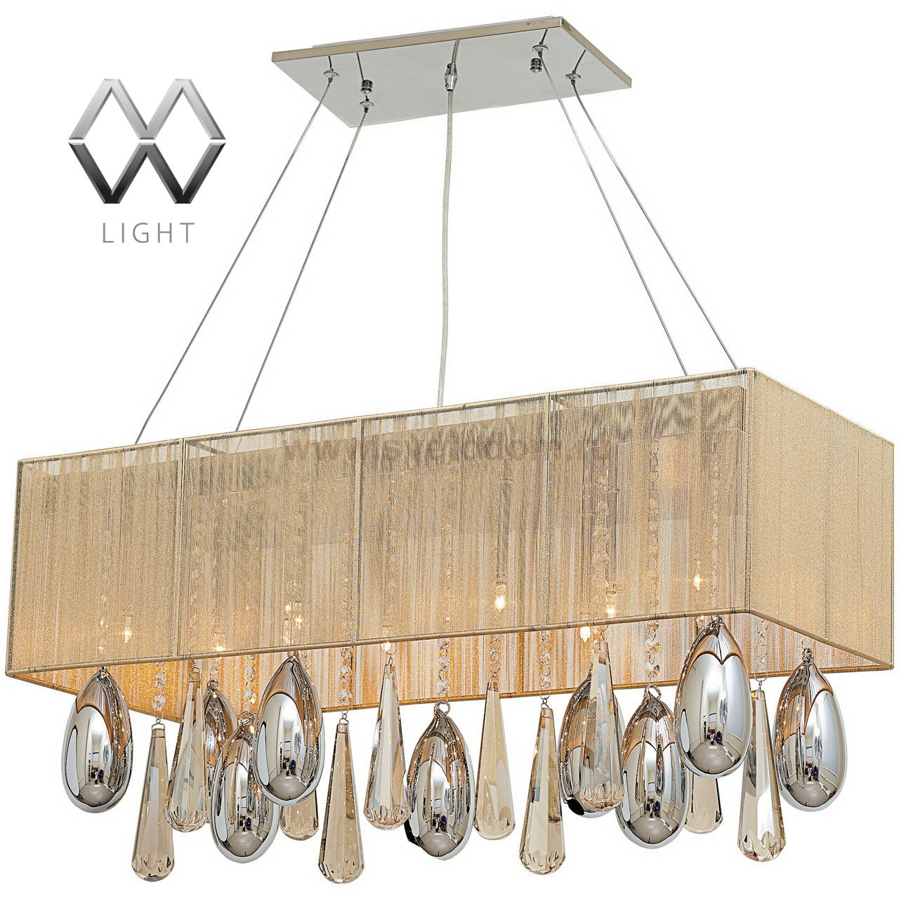 Металлическое основание цвета хрома, абажур, обтянутый тонкими нитями золотого цвета. Декоративные элементы из гальванизированного хрусталя и стекла Материал плафона