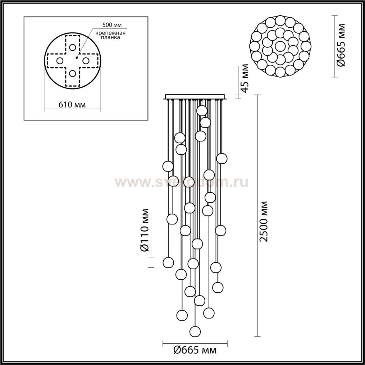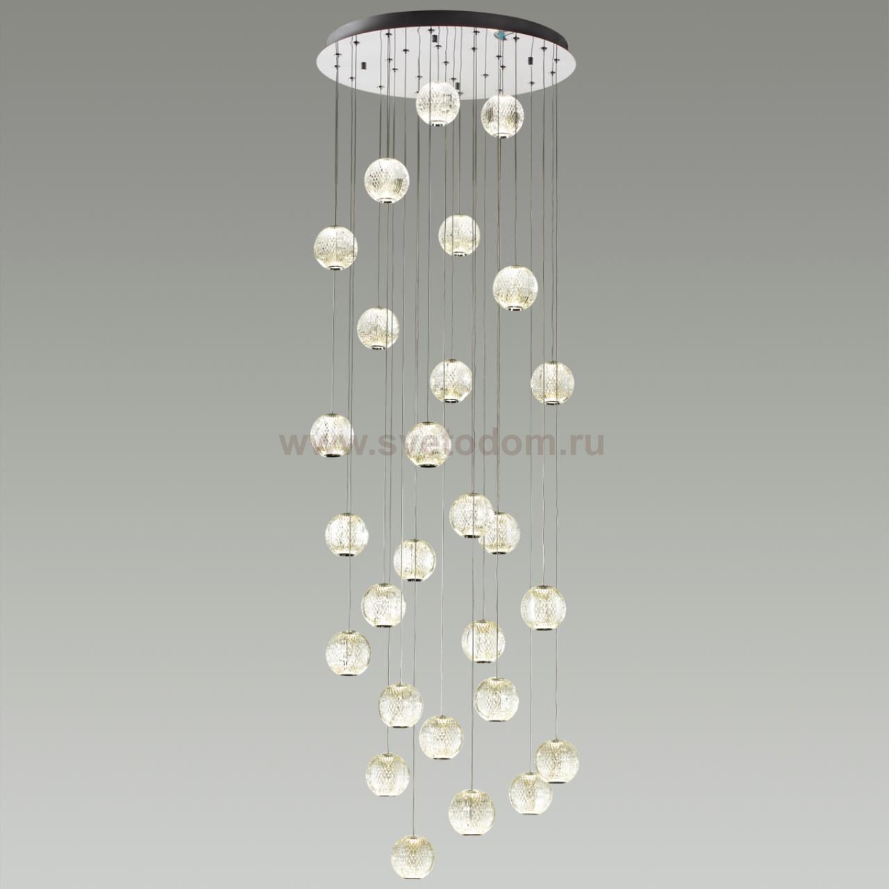 Великолепная светодиодная линия Crystal поражает изяществом, лаконичностью и многообразием модельного ряда. Люстра для помещений с высокими потолками, лестничных пролетов в коттеджах и залов со вторым светом в 2-х цветах арматуры — золото и хром прекрасно украсит интерьер в различных стилях — от неоклассики до хайтека. Множество акриловых шариков, имитирующих хрустальную резную фактуру, создадут непередаваемую игру света и переливов. Максимальная длина подвеса 2,5 м. Общую длину люстры и расположение подвесов можно регулировать самостоятельно. Модель имеет удобную систему установки подвесов в потолочную базу.