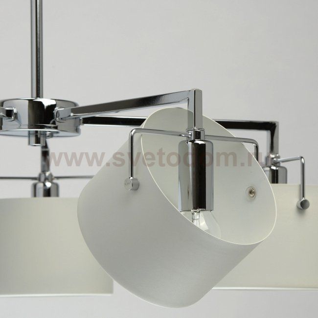Основание светильника выполнено из металла и гальванизировано в цвет хрома. Металлические плафоны обработаны по технологии порошкового окрашивания в белый цвет. Источники света закрыты белым матовым акрилом. Комментарий