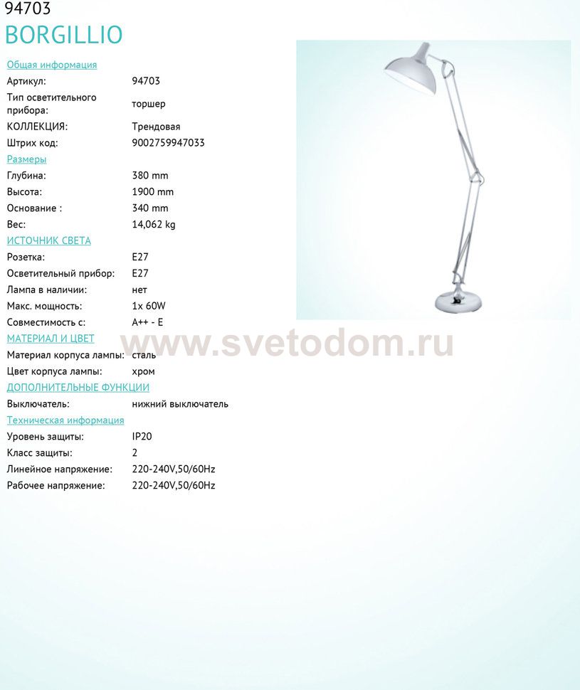 Торшер – это не просто функциональный предмет интерьера, позволяющий обеспечить дополнительное освещение, но и оригинальный декоративный элемент. Интернет-магазин «Светодом» предлагает стильные модели от известных производителей по доступным ценам. У нас Вы найдете и классические напольные светильники, и современные варианты. Торшер 94703 Eglo сразу же привлекает внимание благодаря своему необычному дизайну. Модель выполнена из качественных материалов, что обеспечит ее надежную и долговечную работу. Такой напольный светильник можно использовать для интерьера не только гостиной, но и спальни или кабинета. Купить торшер 94703 Eglo по выгодной стоимости Вы можете с помощью нашего сайта. У нас склады в Москве, Екатеринбурге, Санкт-Петербурге, Новосибирске и другим городам России.