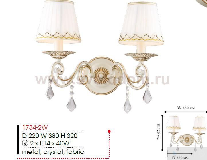 Выбирая модель светильника Favourite 1734-2W, обратите внимание, что каркас окрашен в цвет слоновой кости с позолотой, абажур из белой ткани украшен тесьмой с золотистым узором, хрустальные подвески высшего качества. Дополнительная информация в характеристиках или по телефону. |