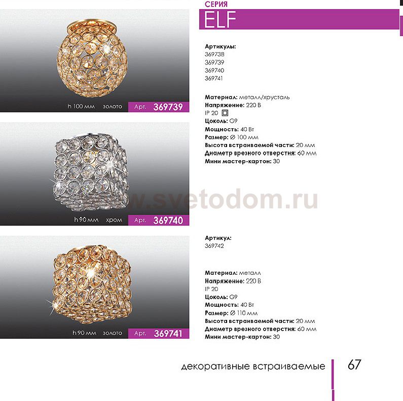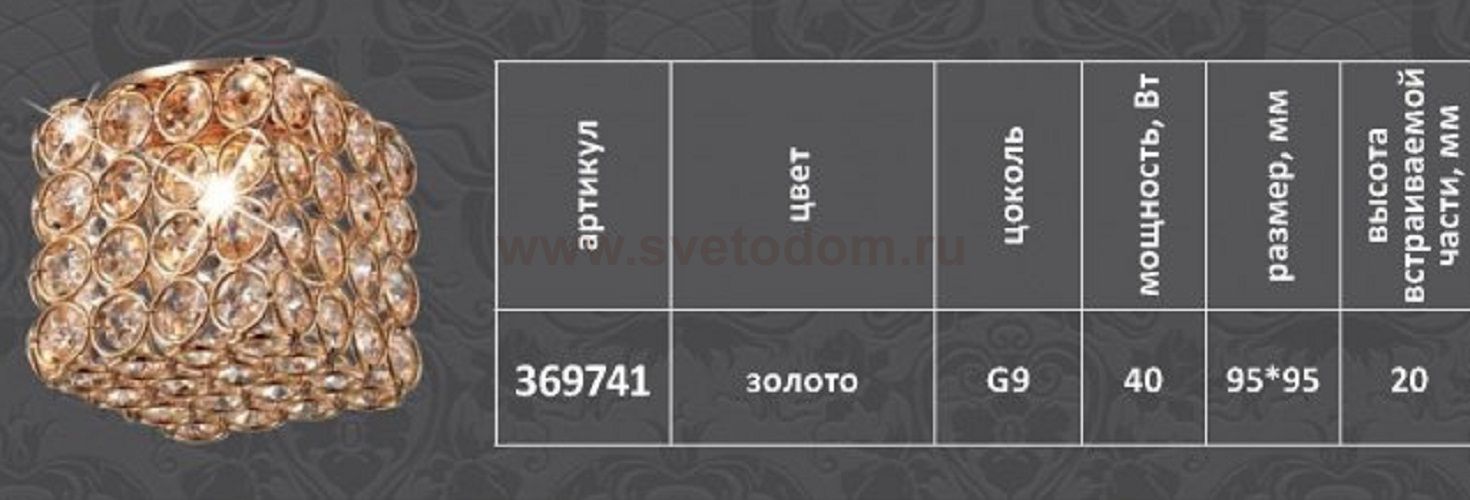 Декоративный встраиваемый светильник модели Novotech 369741 из серии ELF отличается следующим качеством: Светильник сделан из металла. Это популярный и востребованный материал благодаря ряду качеств. К ним относится: повышенная прочность, износостойкость и долговечность. Любому интерьеру они придадут солидности и завершенности, помогут расставить акценты. Декоративное украшение произведено из хрусталя. Он обладает высоким показателем плотности, прозрачности и блеска. Благодаря содержанию свинца (не менее 30%) и определённому подбору углов, образуемых гранями, изделия из хрусталя отличаются необыкновенно яркой, многоцветной игрой света, чарующей магией красоты, совершенства и роскоши.