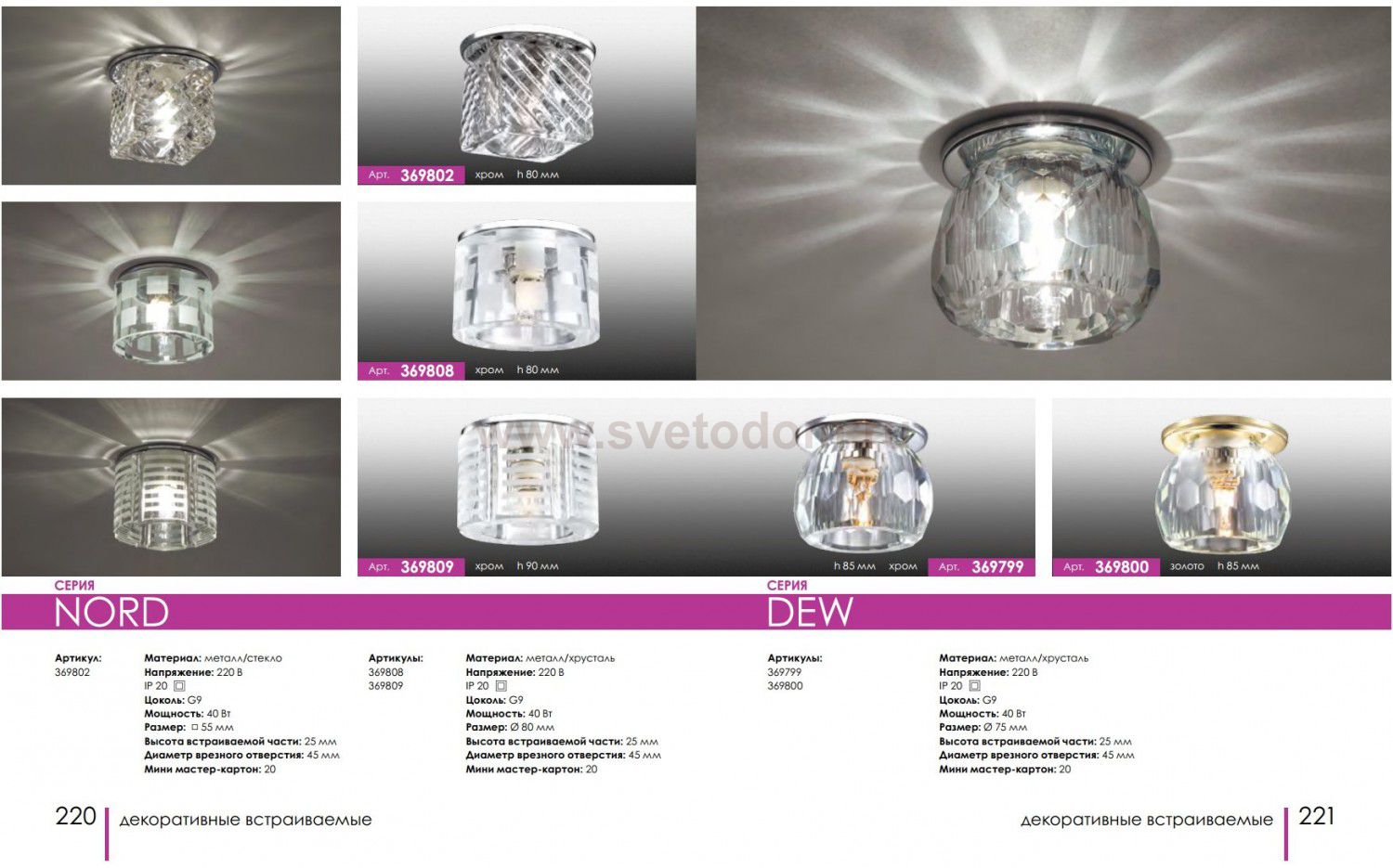 Декоративный встраиваемый светильник модели Novotech 369809 из серии NORD отличается следующим качеством: Основание светильника сделано из металла. Это популярный и востребованный материал благодаря ряду качеств. К ним относится: повышенная прочность, износостойкость и долговечность. Декоративный плафон произведен из хрусталя. Он обладает высоким показателем плотности, прозрачности и блеска. Благодаря содержанию свинца (не менее 30%) и определённому подбору углов, образуемых гранями, изделия из хрусталя отличаются необыкновенно яркой, многоцветной игрой света, чарующей магией красоты, совершенства и роскоши.