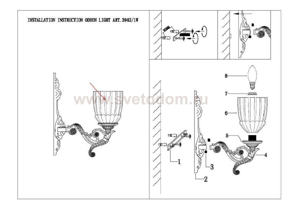арматура, декор: металл, резные элементы на рожках; плафон: стекло Материал плафона
