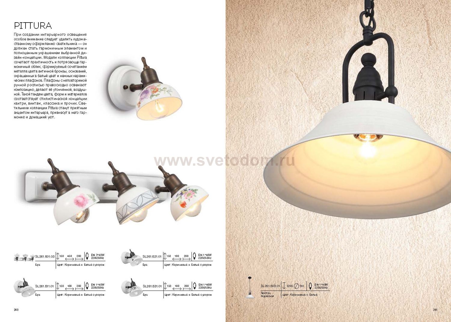 Если Вы настроены купить светильник модели SL26152101, то обратите внимание: При создании интерьерного освещения особое внимание следует уделить художественному оформлению светильника – он должен стать гармоничным элементом и полноценным украшением выбранной дизайн-концепции. Модели коллекции Pittura сочетают практичность и потрясающе гармоничный облик, формируемый сочетанием металла цвета античной бронзы , оснований, окрашенных в белый цвет и нежных керамических плафонов. Плафоны с неповторимой ручной росписью превосходно освежают композицию, делают её утонченной, воздушной. Такой тандем цвета, форм и материалов соответствует стилистической концепции кантри, винтаж, классика и прочих. Светильники коллекции Pittura станут приятным акцентом интерьера, привнесут в него гармонию и домашний уют