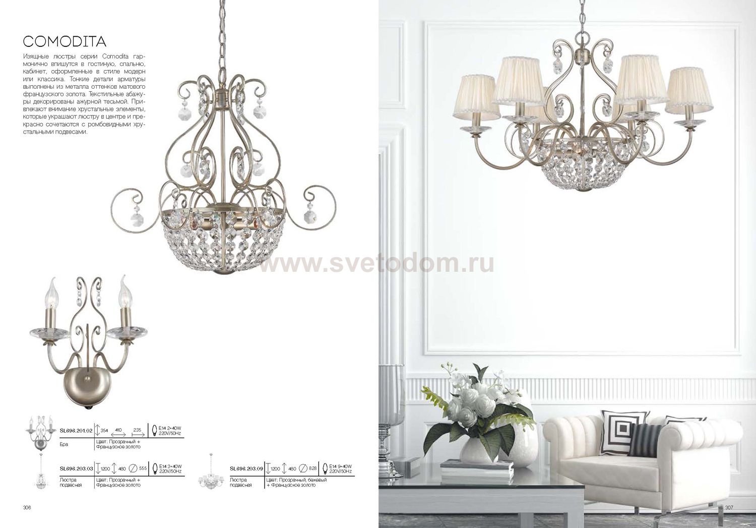 Касаемо коллекции модели St luce SL696.203.03 хотелось бы отметить основные моменты: Изящные люстры серии Сomodita гармонично впишутся в гостиную, спальню, кабинет, оформленные в стиле модерн или классика. Тонкие детали арматуры выполнены из металла оттенков матового французского золота. Привлекает внимание хрустальные элементы, которые украшают люстру в центре и прекрасно сочетаются с ромбовидными хрустальными подвесами.