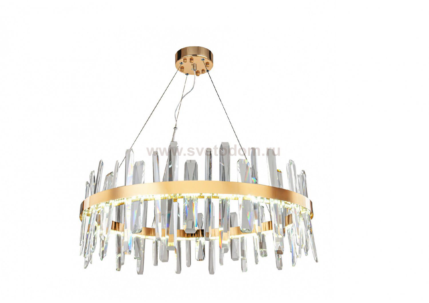 Люстра Gertrudis выполнена в форме массивного металлического кольца золотого цвета, с прикрепленными к внутренней стенке вытянутыми элементами из прозрачного стекла. Подвешивается к потолочной планке при помощи четырех прочных нитей. Подходит для гостиных, офисных приемных, кабинетов руководителей и заведений торгово-развлекательного назначения.
