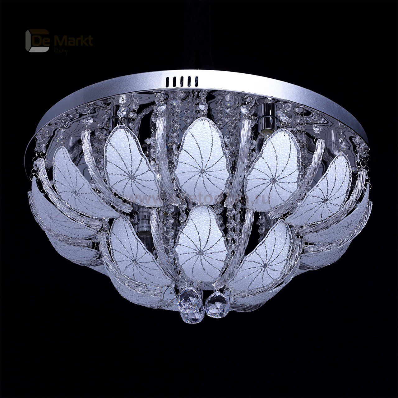 Корпус светильника выполнен из сплава металла и окрашен в серый цвет. Снизу к корпусу крепится тонкий лист отполированной нержавеющей стали. Декоративные элементы выполнены из оплавленного стекла и отлиты в форме изогнутых лепестков. С внутренней стороны стеклянные лепестки окрашены белой краской и декорированы рисунком, нанесенным вручную. Дополняют композицию светильника подвески из хрусталя двух видов. Дополнительно