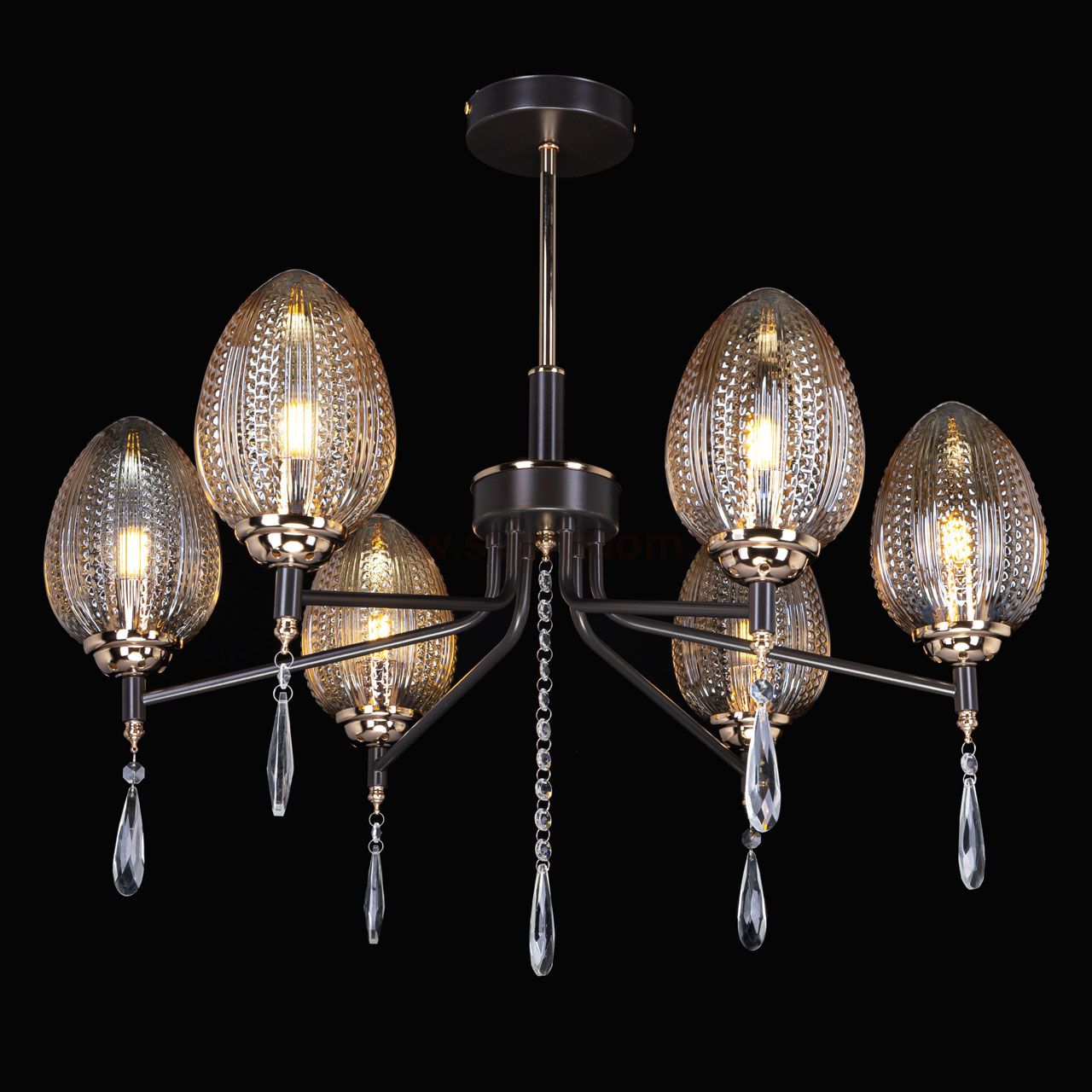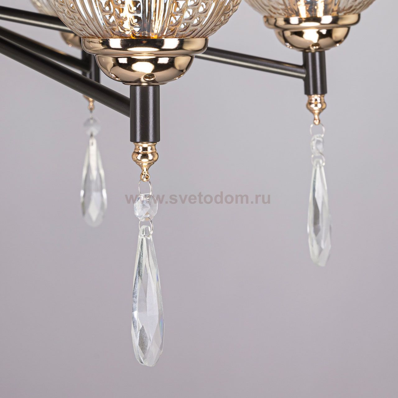 Металлическое основание потолочной люстры окрашено в цвет кофе. Отдельные элементы основания гальванизированы в цвет золота. Плафоны выполнены из фактурного стекла, отлитого в сложную форму и гальванизированного в цвет шампань. Потолочная люстра декорирована прозрачным хрусталем каплевидной формы. Комментарий