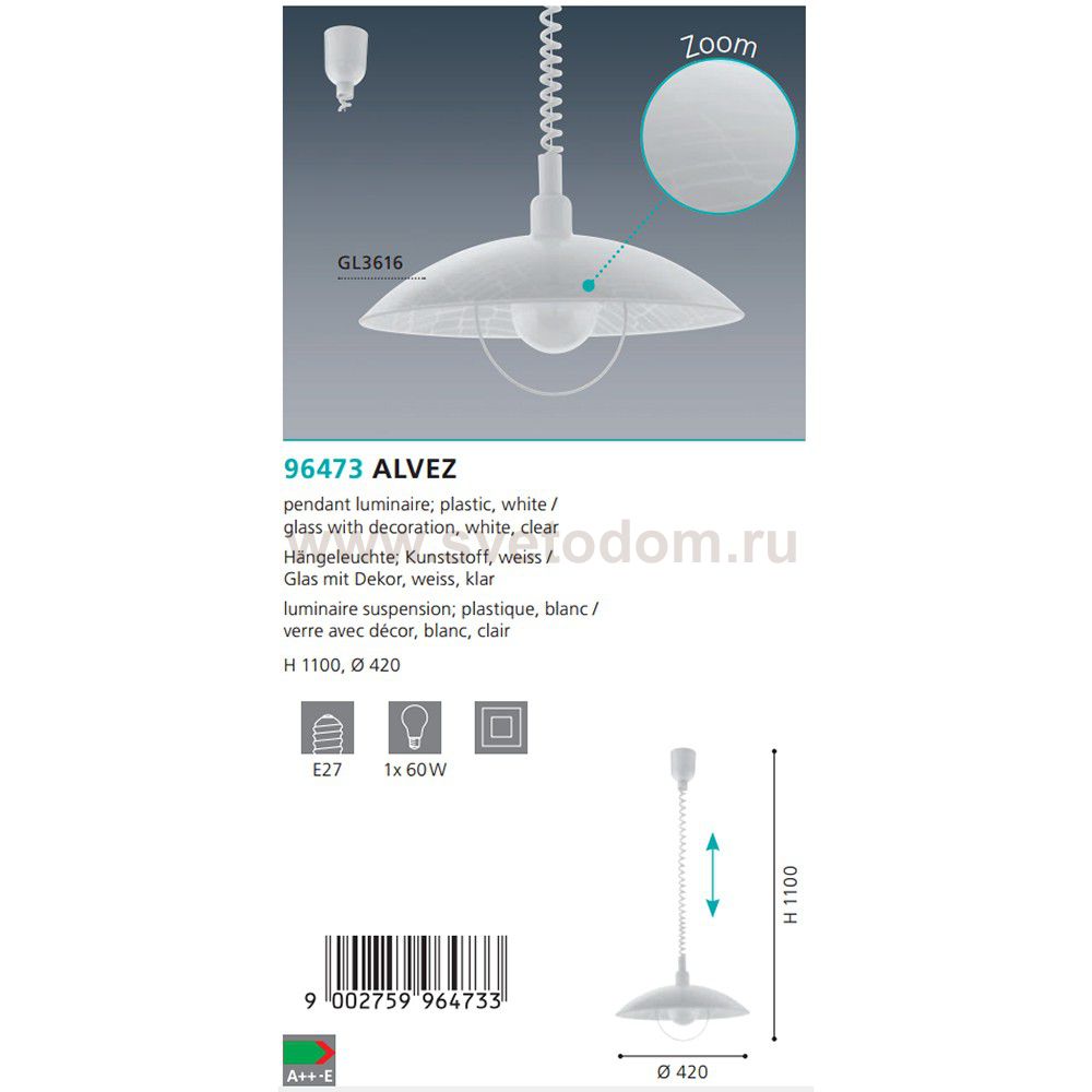 Подвесной светильник Eglo 96473 ALVEZ отличается регулировкой по высоте и сделает Ваш интерьер современным, стильным и запоминающимся! Наиболее функционально и эстетически привлекательно модель будет смотреться в гостиной, зале, холле или другой комнате. А в комплекте с люстрой, бра или торшером из этой же коллекции сделает ремонт по-дизайнерски профессиональным и законченным.