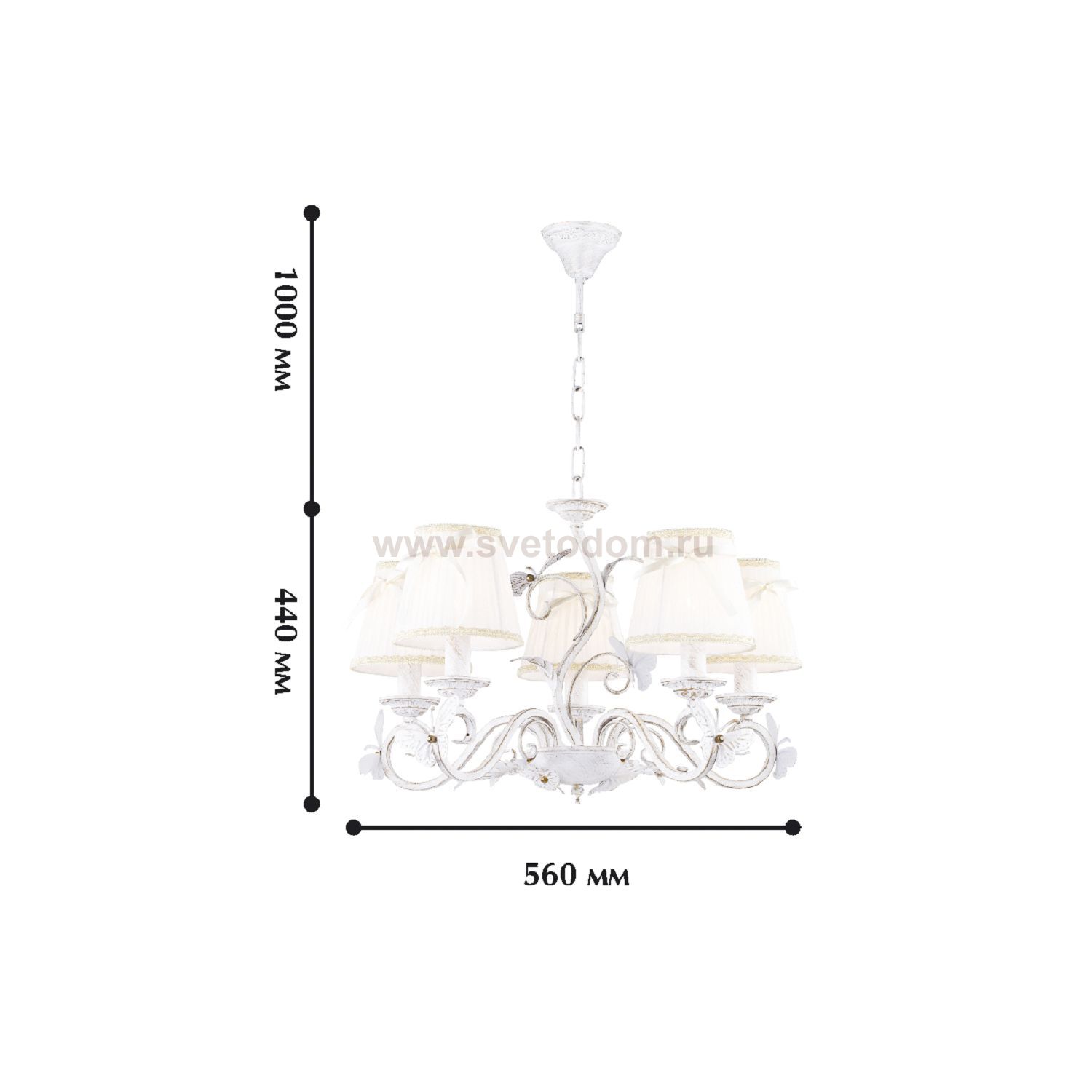 каркас окрашен в белый цвет с золотой патиной, абажур из ткани цвета слоновой кости украшен тесьмой с золотистым узором и белой атласной лентой, хрустальные подвески высшего качества Штрих-код