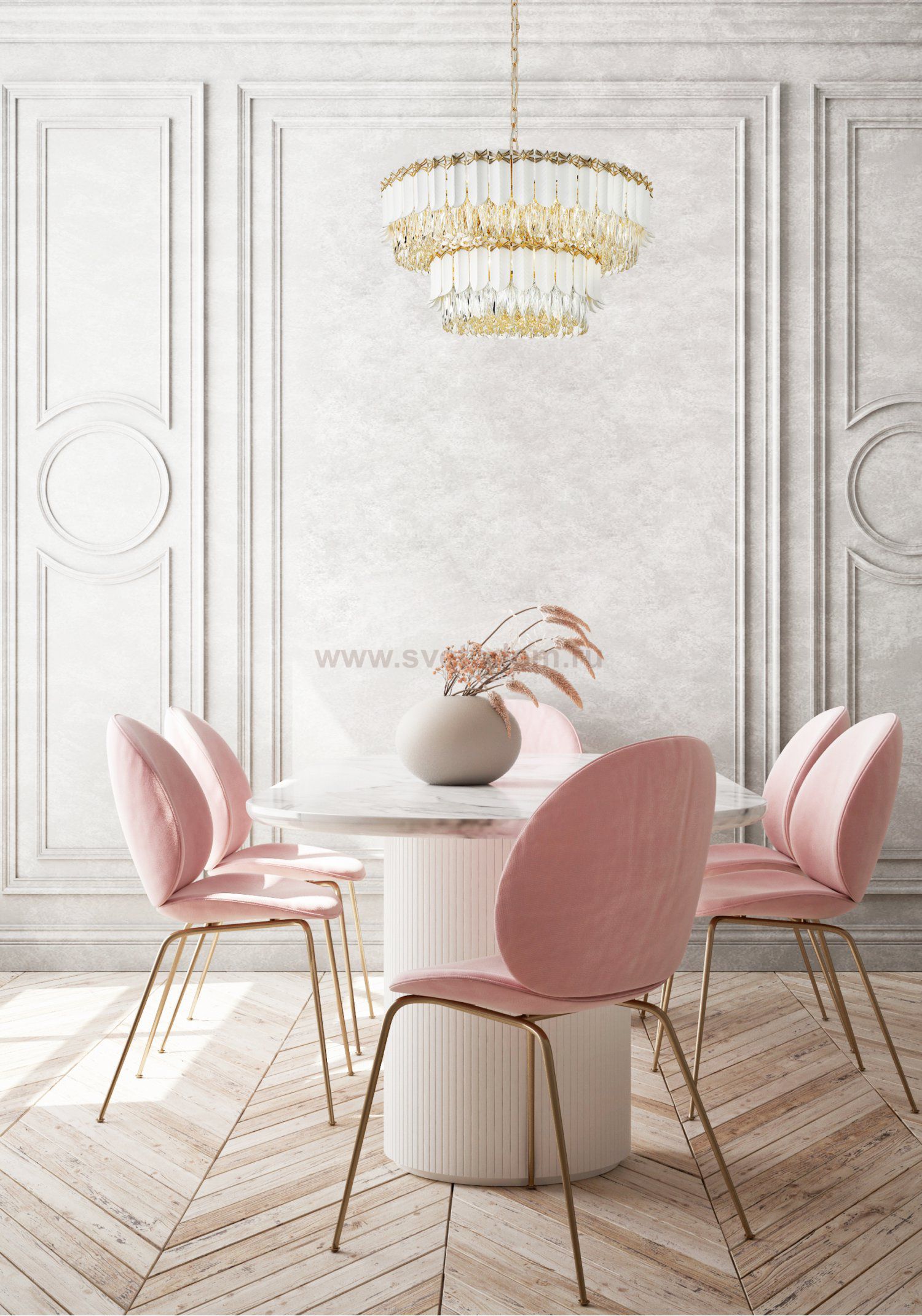 Каркас люстры цвета золото, верхний ряд выполнен из керамических лепестков, которые покрыты белой глазурью и украшены золотым декором. Нижние слои выполнены из высококачественного хрусталя удлиненной формы оригинальной огранки. При укорачивании цепи люстра модифицируется в потолочный светильник Штрих-код