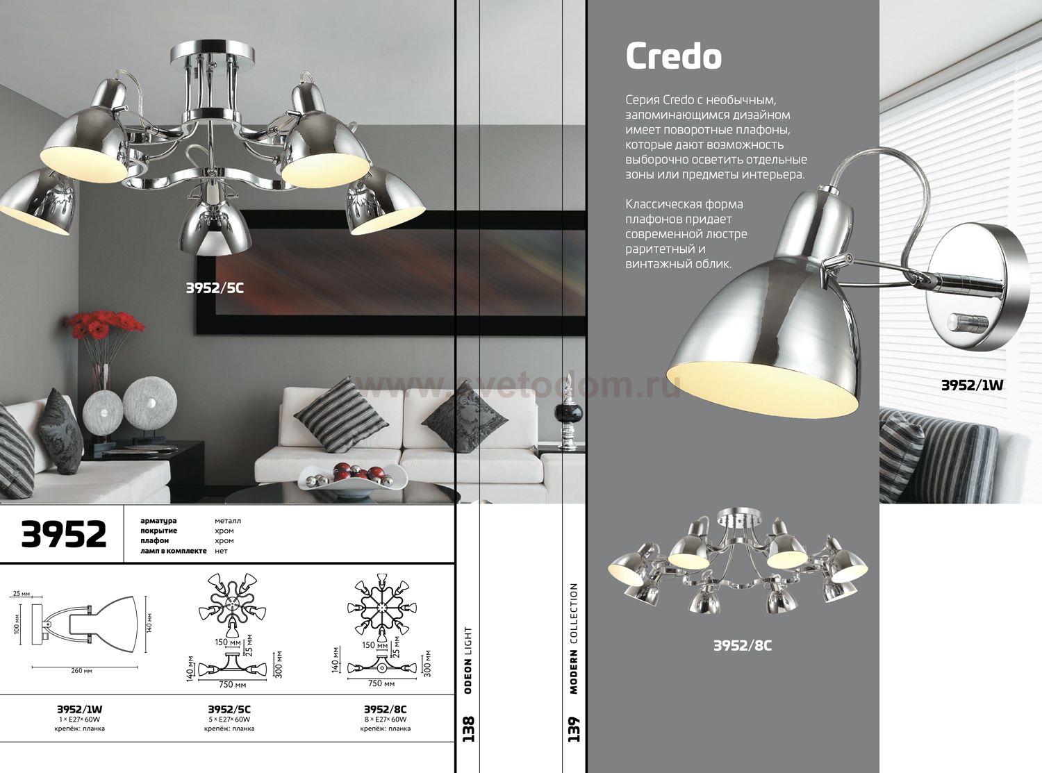 Люстра 3952 / 8C линии Credo с необычным, запоминающимся дизайном имеет поворотные плафоны, которые дают возможность выборочно осветить отдельные зоны или предметы интерьера. Классическая форма плафонов придает современной люстре раритетный и винтажный облик. Цоколь E27. Мощность 8*60W. Нет ламп в комплекте.