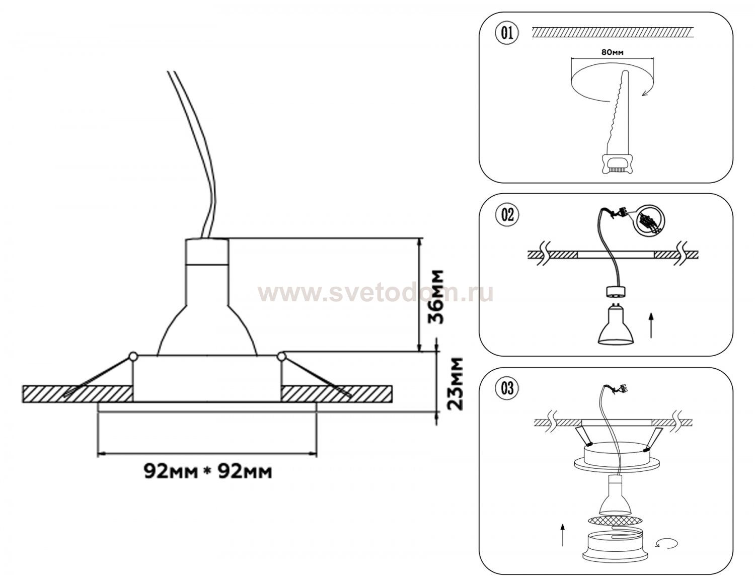 Данный размер указывает какое отверстие необходимо сделать для правильного монтажа. Зачастую светильники выбирают после ремонта и сделанных монтажных отверстий, тогда подбор осуществляется строго в размер +/- 2-5мм.