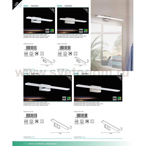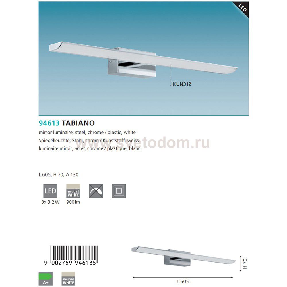 светильник для ванной комнаты и зеркал Eglo 94613 TABIANO сделает Ваш интерьер современным, стильным и запоминающимся! Наиболее функционально и эстетически привлекательно модель будет смотреться в гостиной, зале, холле или другой комнате. А в комплекте с люстрой и торшером из этой же коллекции сделает интерьер по-дизайнерски профессиональным и законченным.