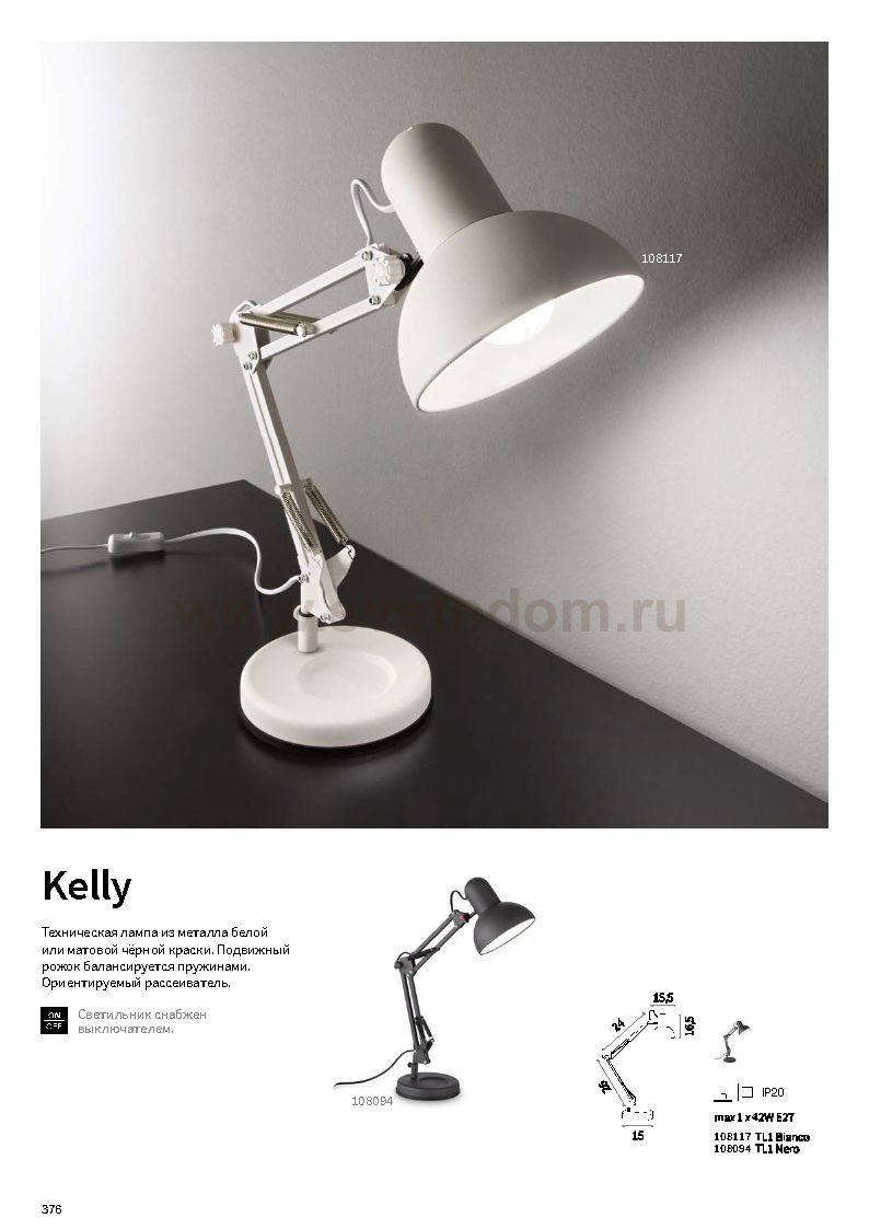 Настольная лампа от известной итальянской фабрики Ideal lux из каталога Moderno в современном стиле под артикулом KELLY TL1 NERO (108094) серии KELLY имеет ряд отличительных характеристик: Техническая лампа из металла белой или матовой чёрной краски. Подвижный рожок балансируется пружинами. Ориентируемый рассеиватель.