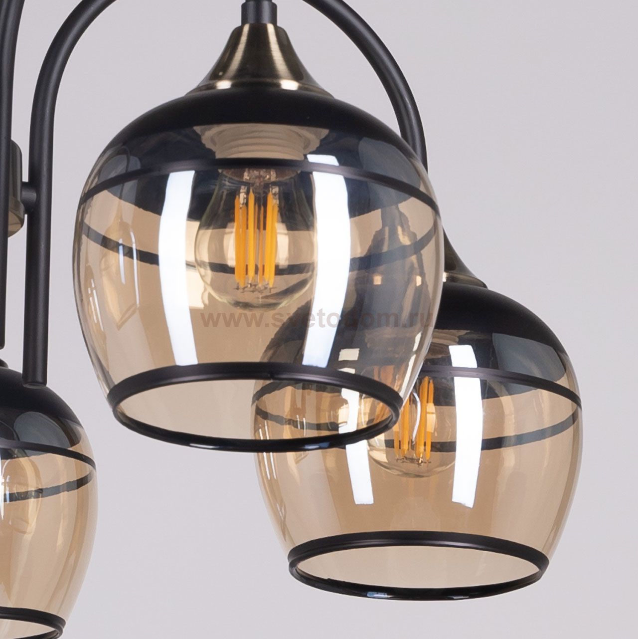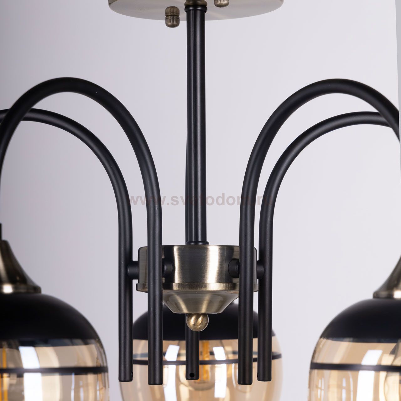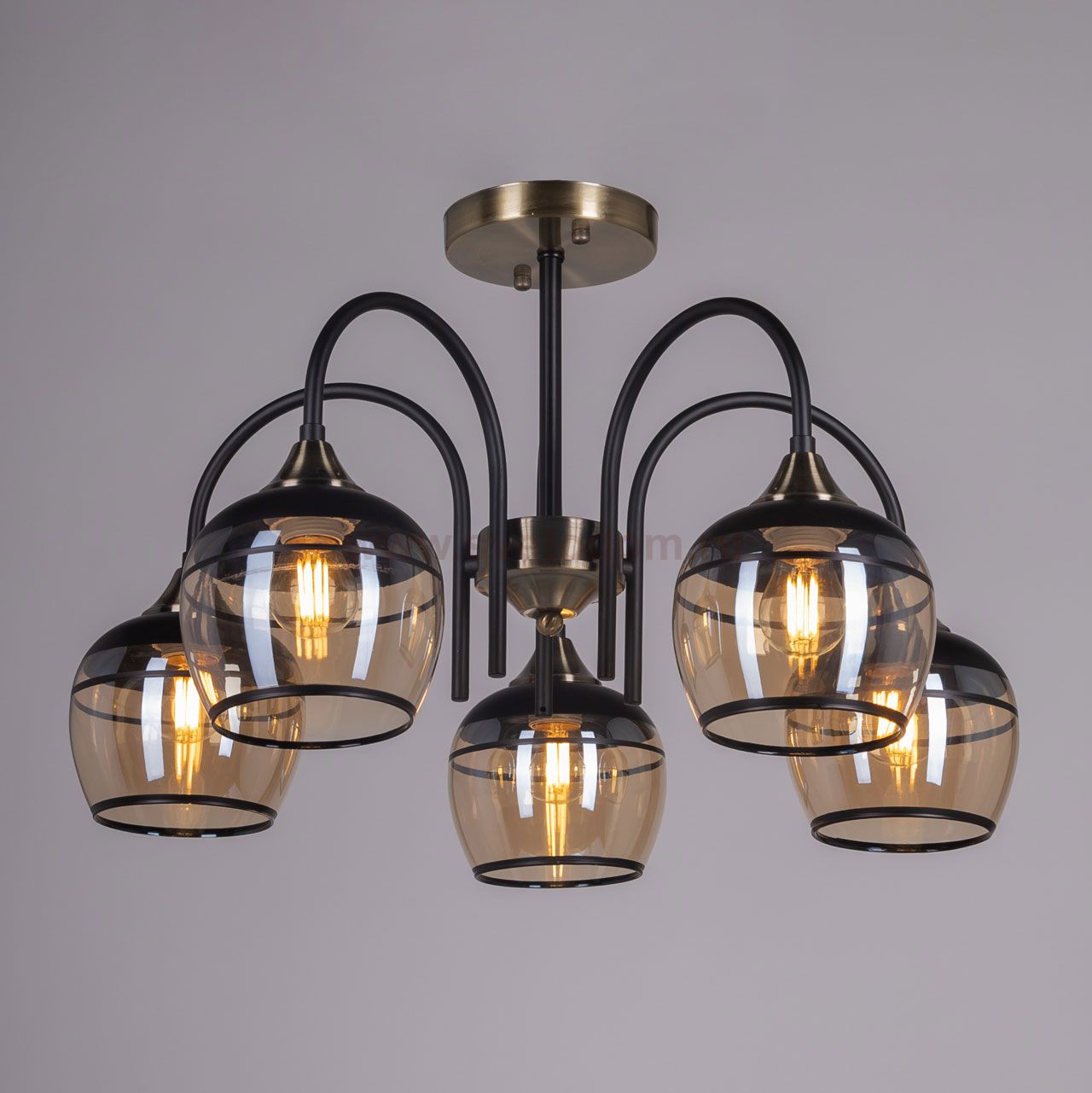 Металлическое основание светильника окрашено в черный цвет. Отдельные элементы основания потолочной люстры гальванизированы в цвет античной бронзы. Потолочная люстра декорирована выдувными вручную стеклянными плафонами, гальванизированными в цвет шампань. У основания плафоны окрашены в черный цвет. Комментарий