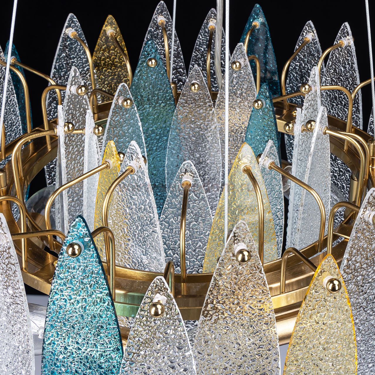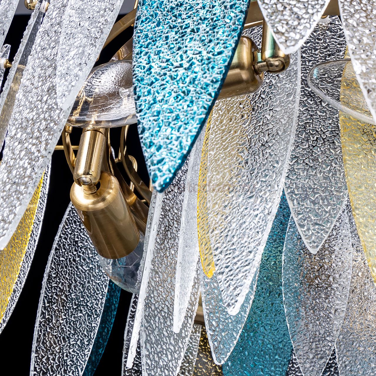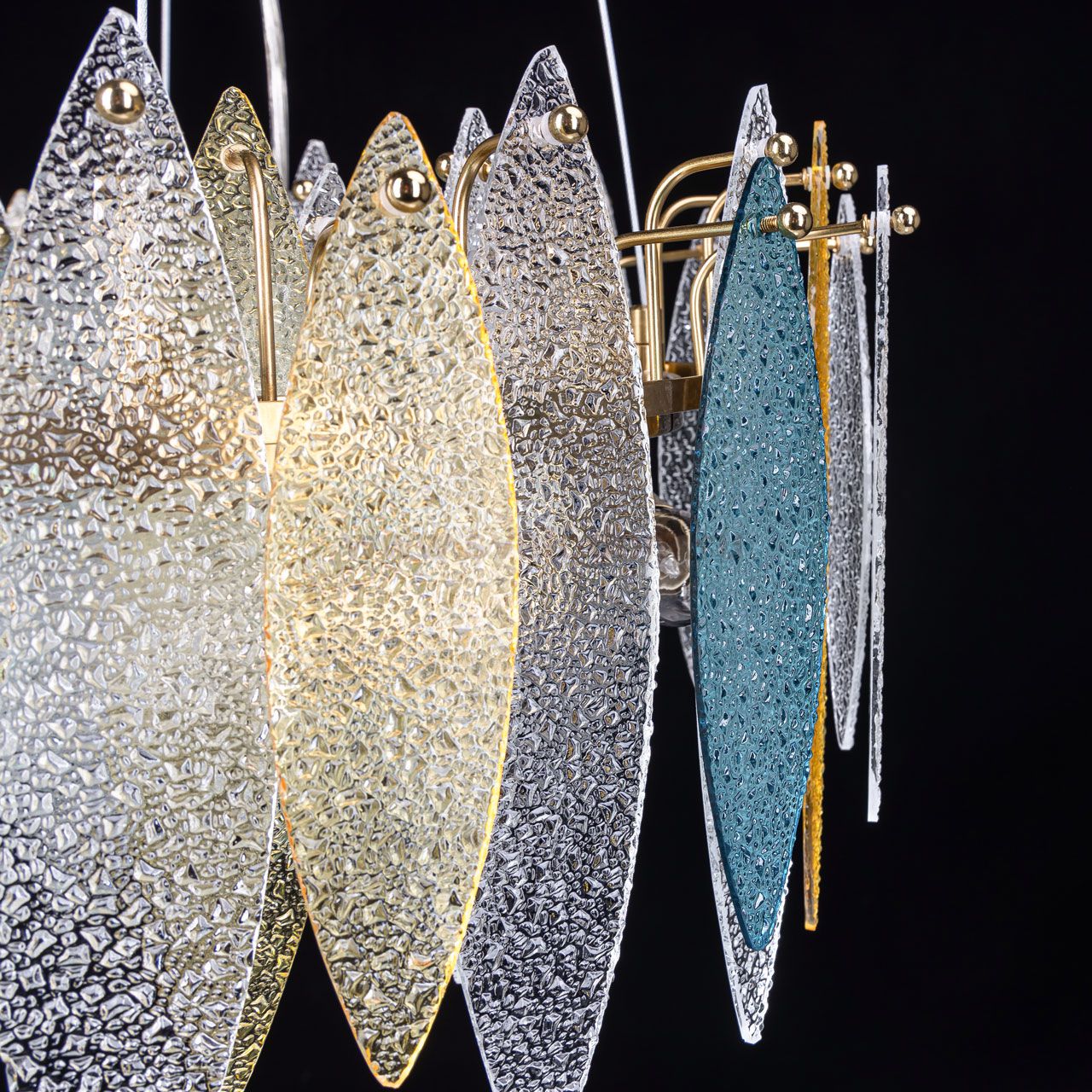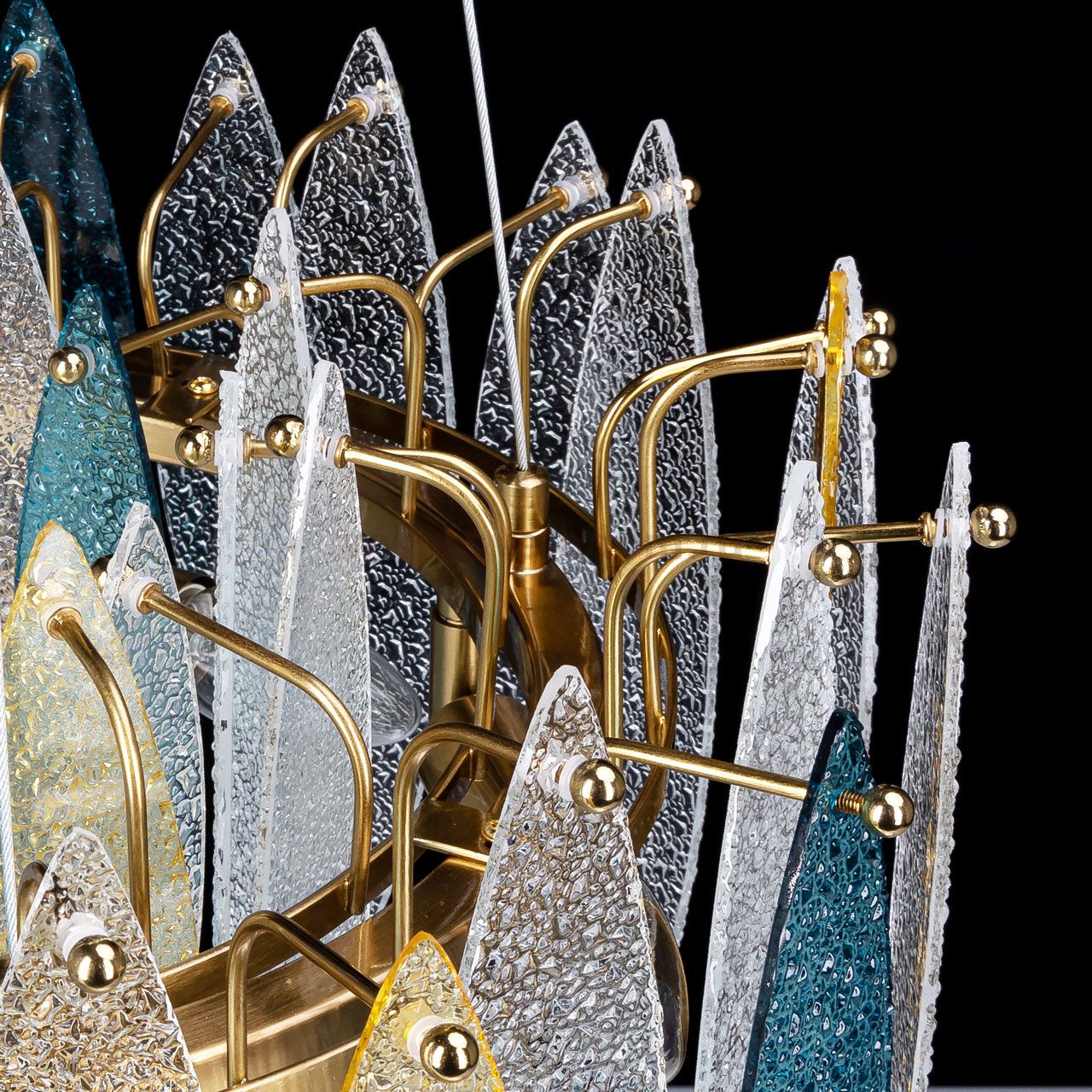 Металлическое основание подвесного светильника гальванизировано в цвет латуни. Люстра декорирована фактурными стеклянными пластинами прозрачными, голубого цвета и цвета шампань. Комментарий