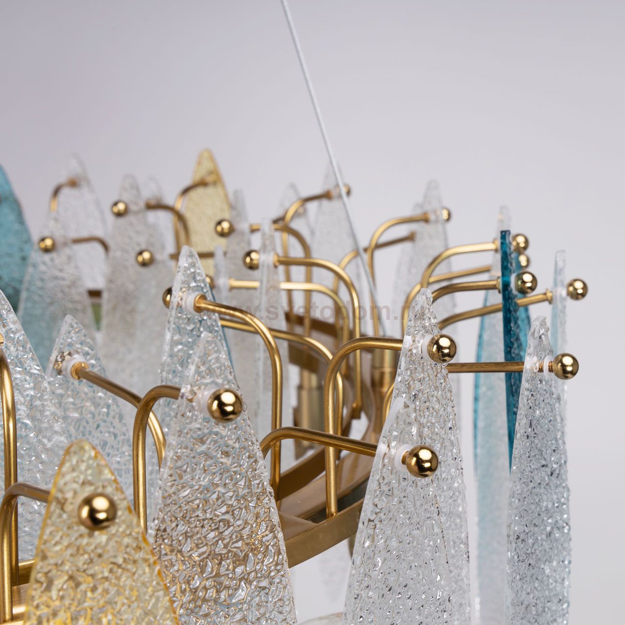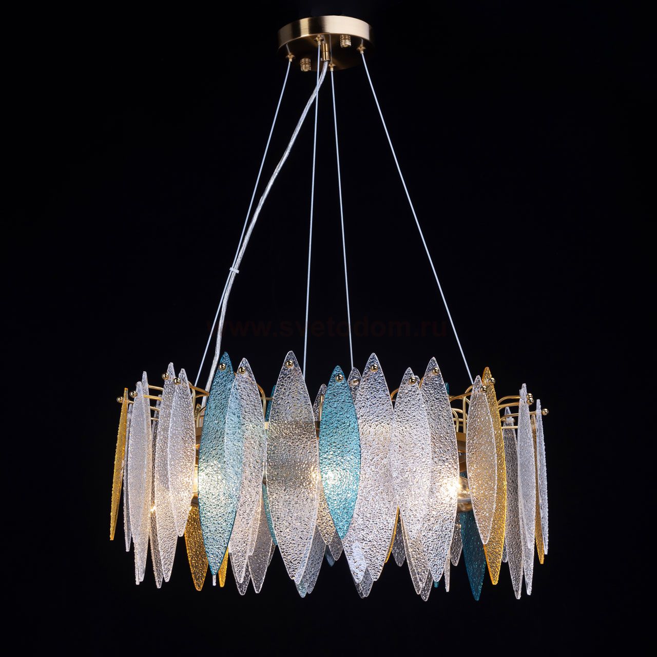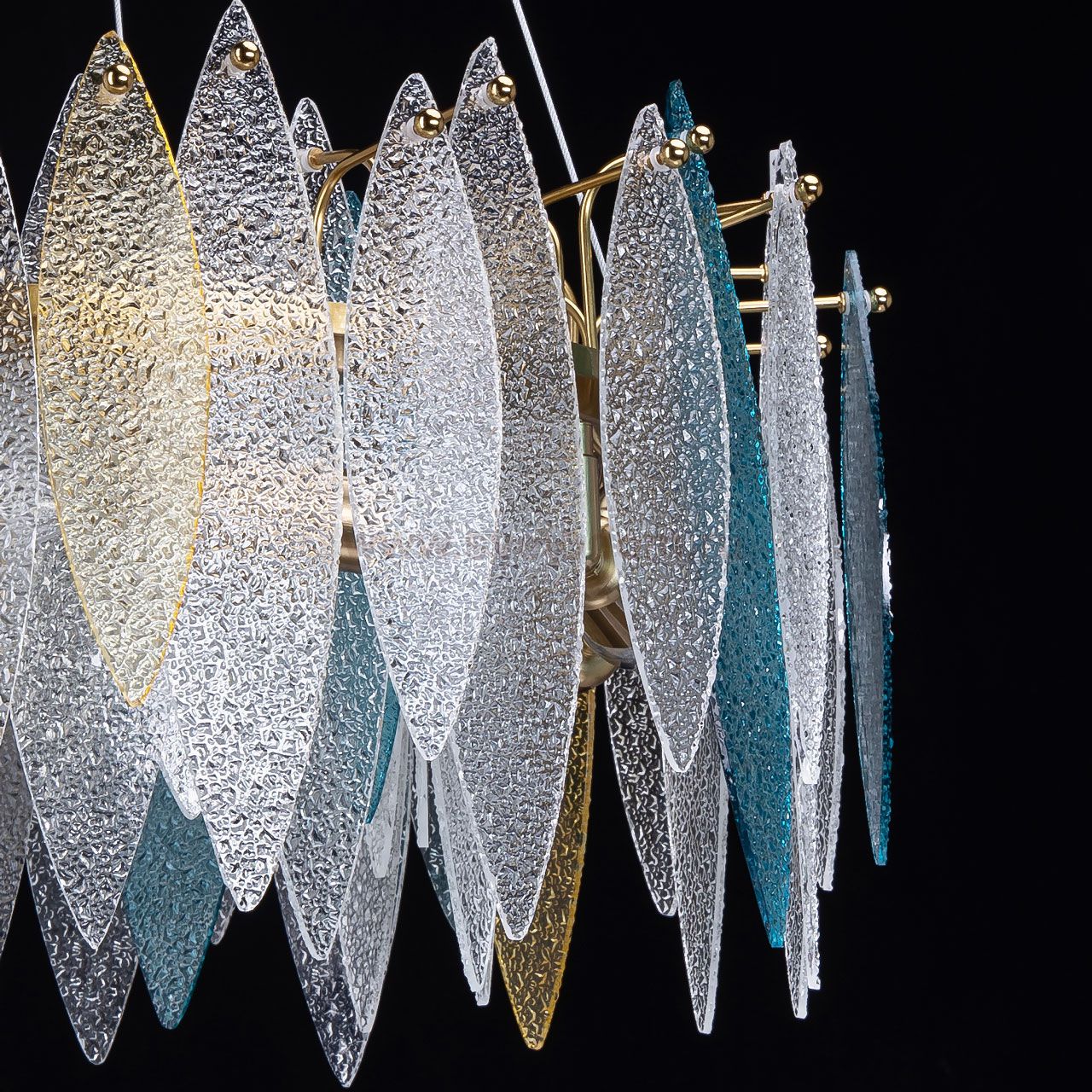 Металлическое основание подвесного светильника гальванизировано в цвет латуни. Люстра декорирована фактурными стеклянными пластинами прозрачными, голубого цвета и цвета шампань. Комментарий