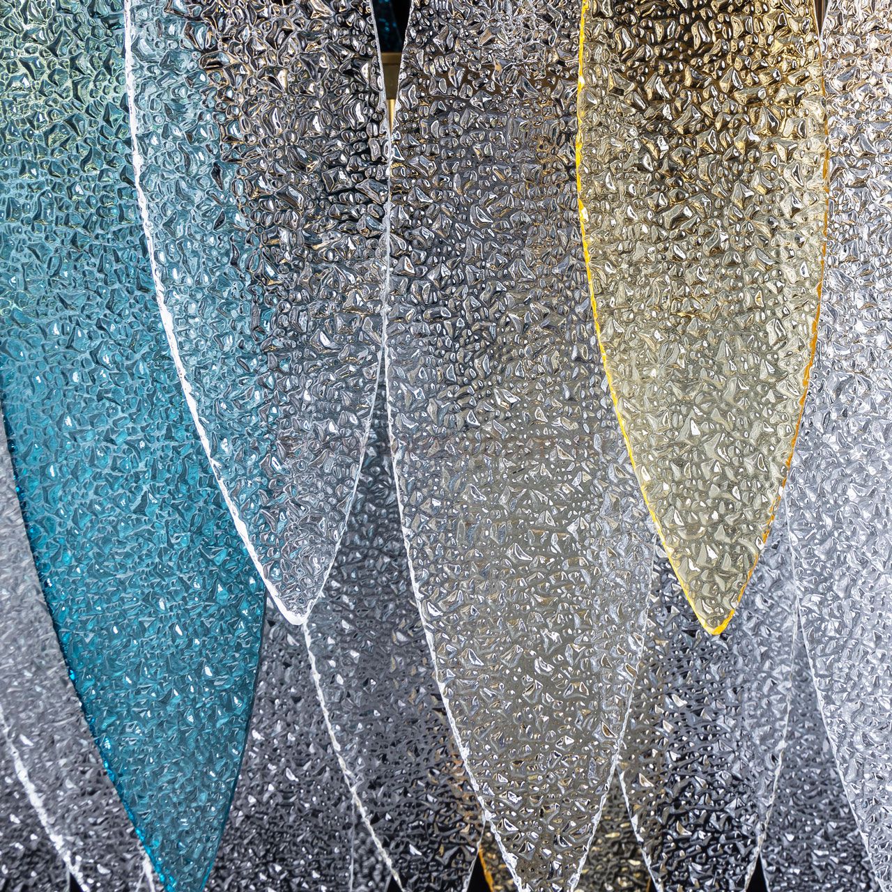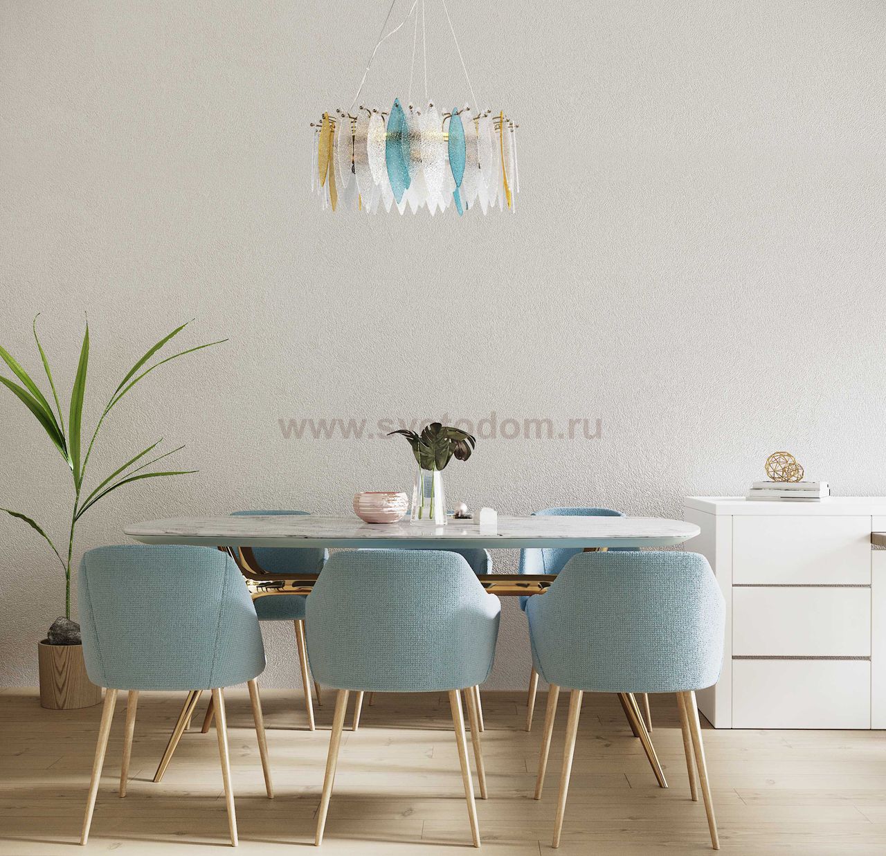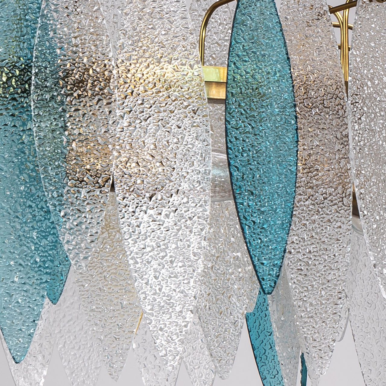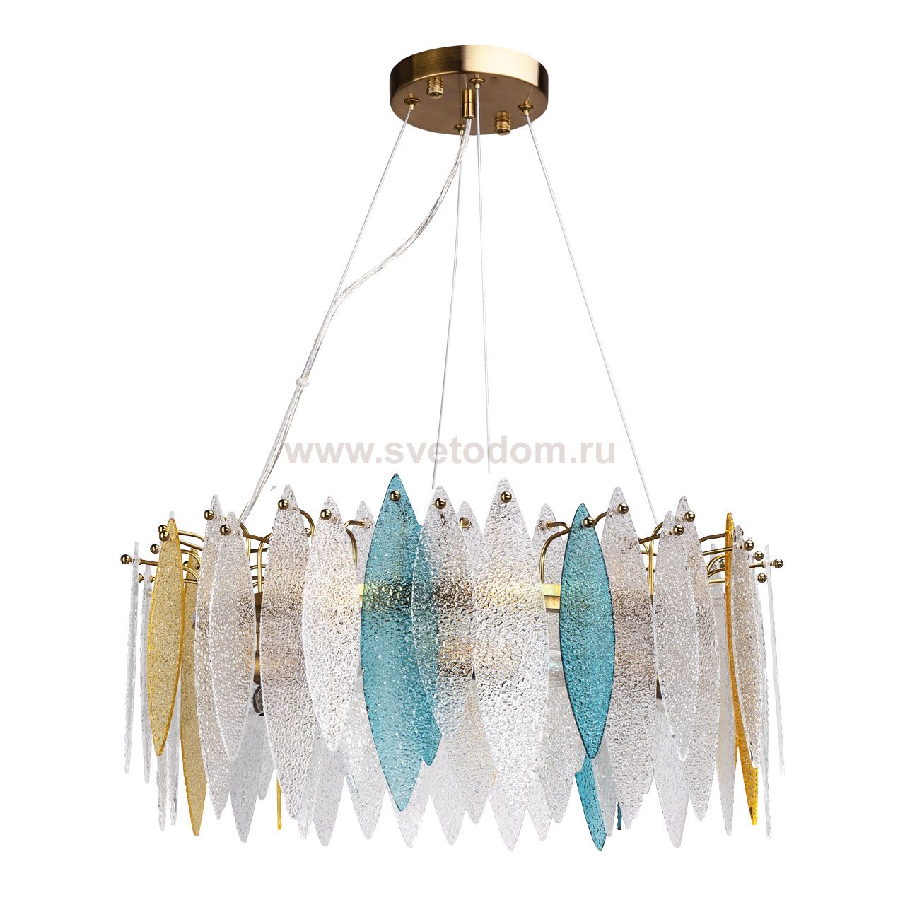 Металлическое основание подвесного светильника гальванизировано в цвет латуни. Люстра декорирована фактурными стеклянными пластинами прозрачными, голубого цвета и цвета шампань. Комментарий