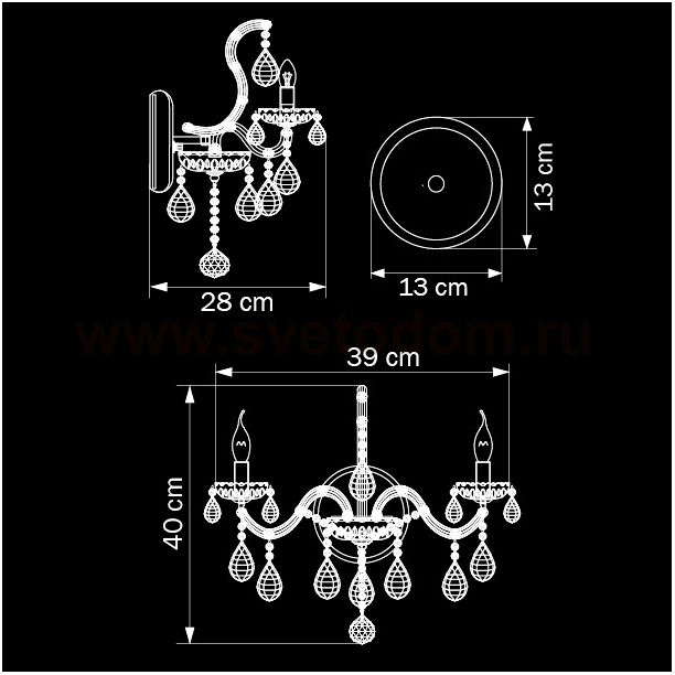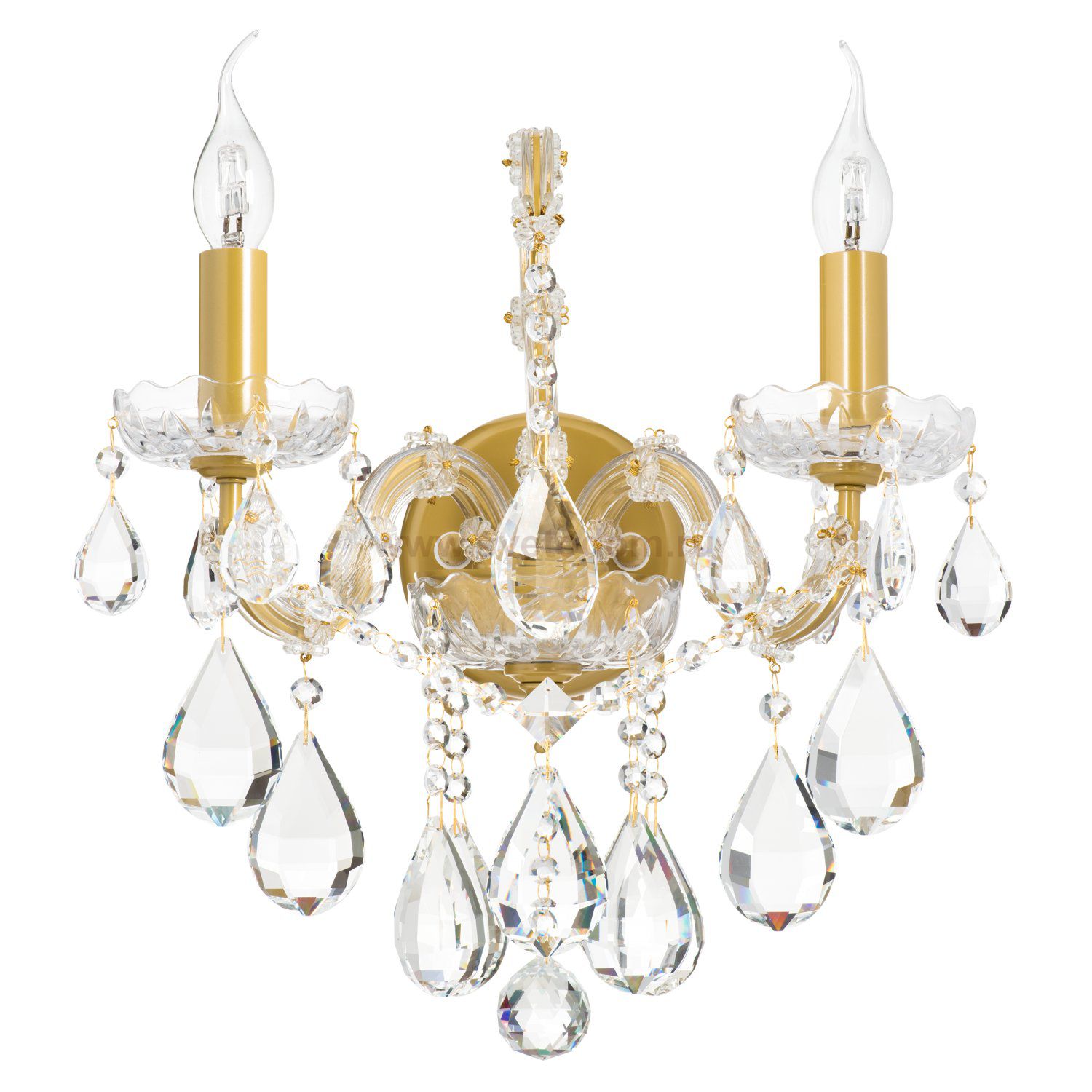 Бра из коллекции Champa это сверкающая классика! Два рожка обильно украшены резными хрустальными подвесками ручной огранки и транслируют свой яркий свет сквозь хрустальные чаши. Матовое золотистое основание частично скрыто за муранским стеклом, сохраняя гармонию взаимодействия яркого и приглушенного блеска.